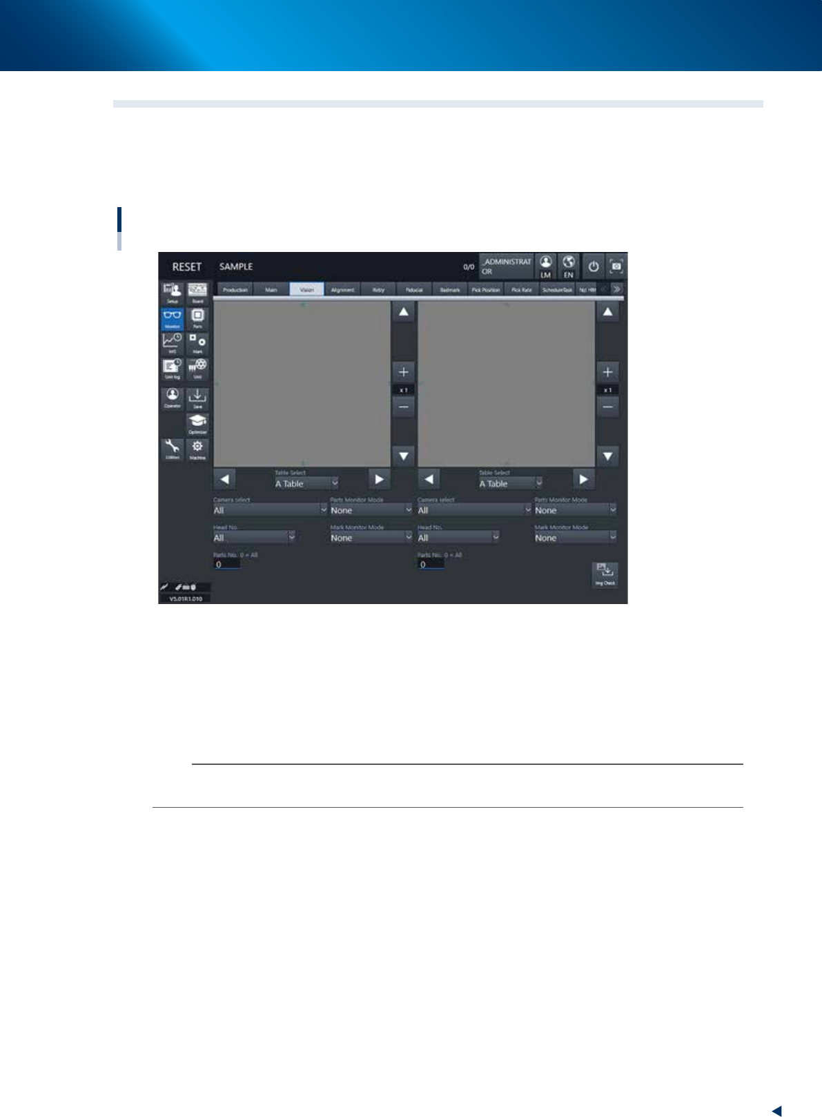 An image is displayed on each left and right of the vision monitor. Select a table, a camera, a head and a part number for