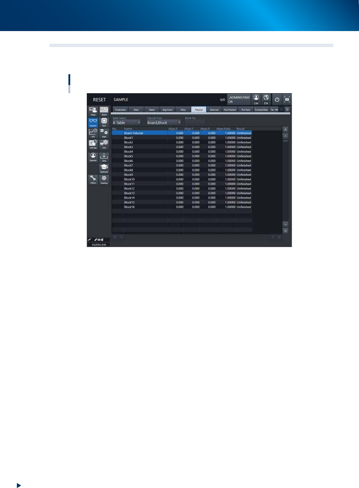 The Fiducial screen shows the results of recognizing fiducial marks such as “Board, Block”, “2 Point Local”