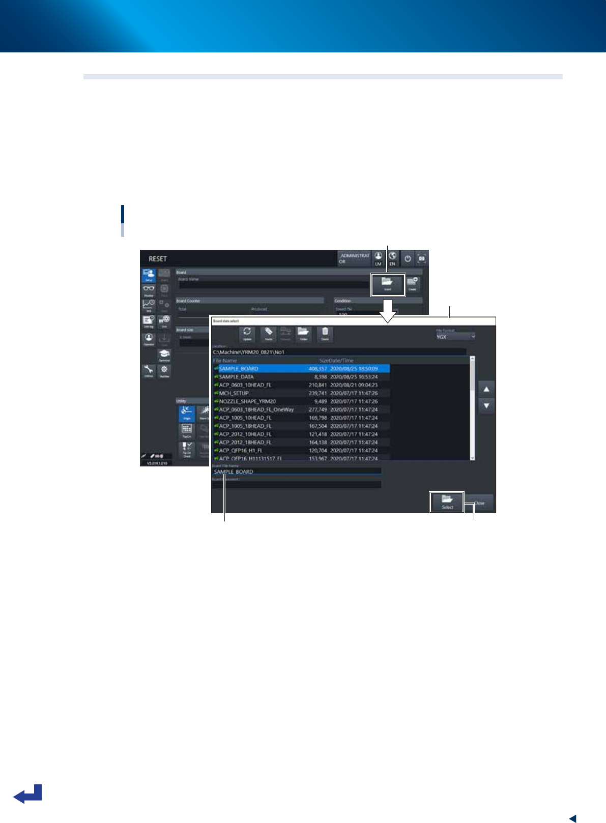 Select the board data used for the production from the list on the “Board Data Select” screen. Press