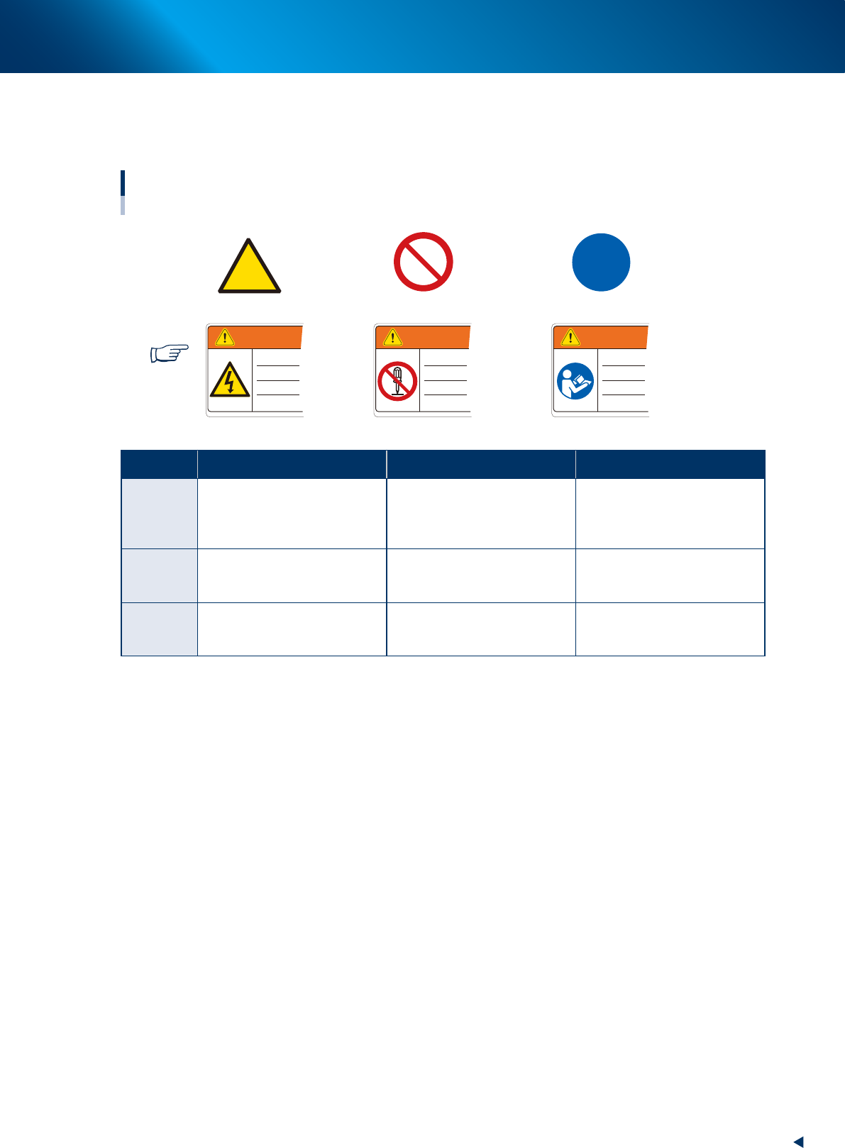 The mark of warning label includes following 3 types. Each mark has its own meaning and is typically used