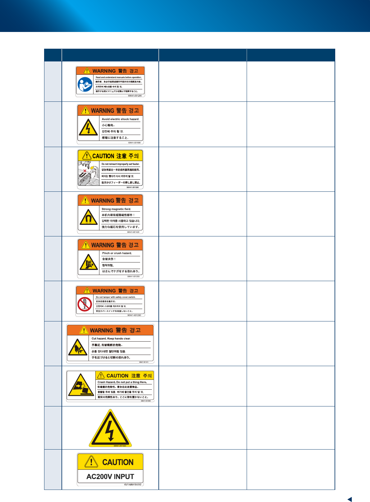 3. Label positions v Safety instructions ► W arning/caution labels (front) No. Label Message Measures 1 Damage to machine or injury to person. Before handling the product (equipment) always read manuals and make sure you…