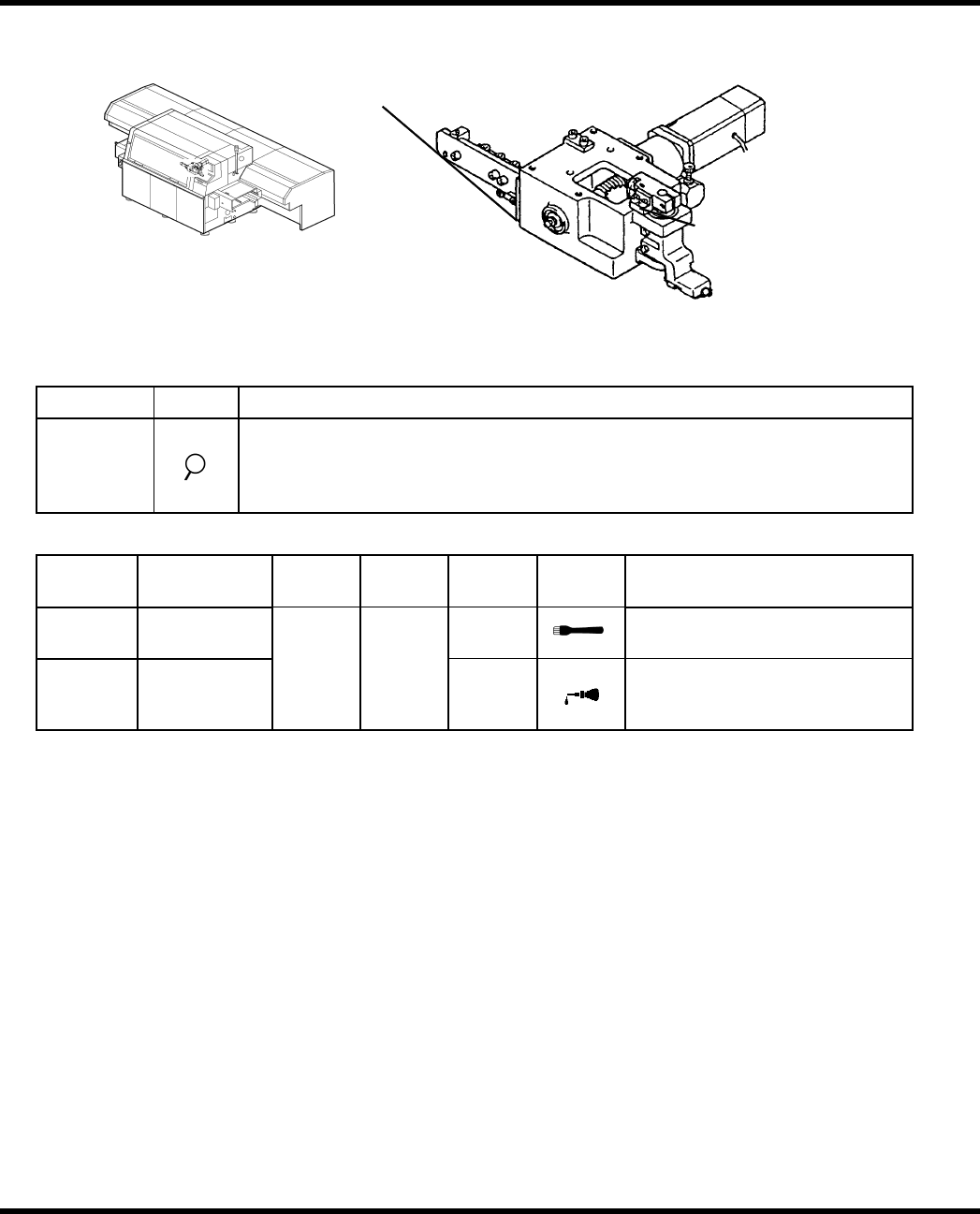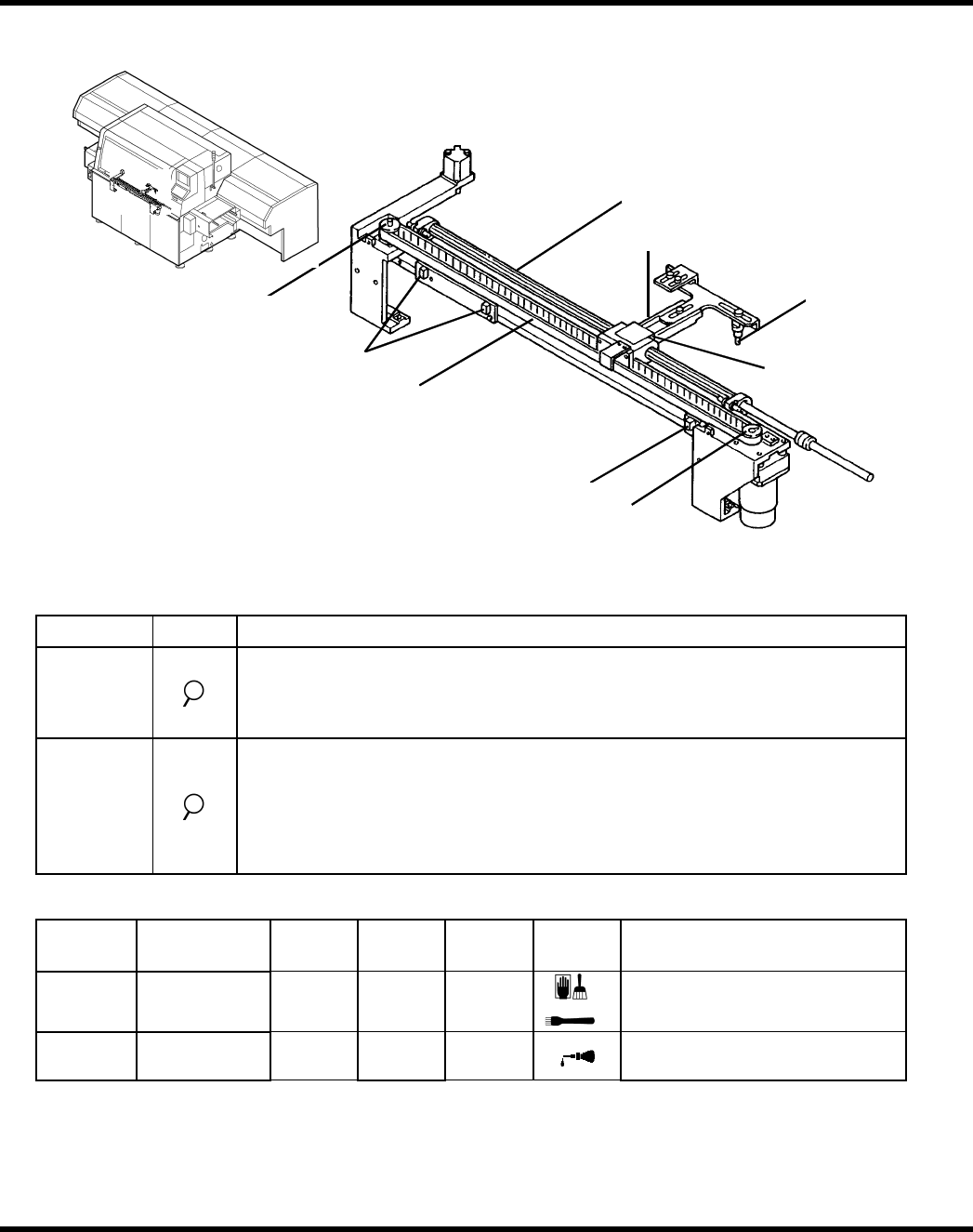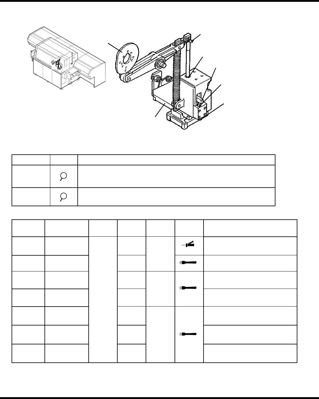 AV K 2 B 维修手册 6.2 常规检查 6.2.19 JW 头装置(驱动装置) [1] 模 块 和 轴 杆滑 动 表面 [6] 轴 杆和 衬 套滑 动 表面 [4] 轴 杆和推 进 器接触表面 [5] 轴 杆和模 块 滑 动 表面 [7] 轴 杆及 轮 附件接触面 [3] 导轨 [2] 凸 轮 表面 图.6.2-16.W 头 装置 检查 周期 工作 检查项目 每天 确保轴上下移动平稳 。 确保滚子随动件转动 平稳。 确…