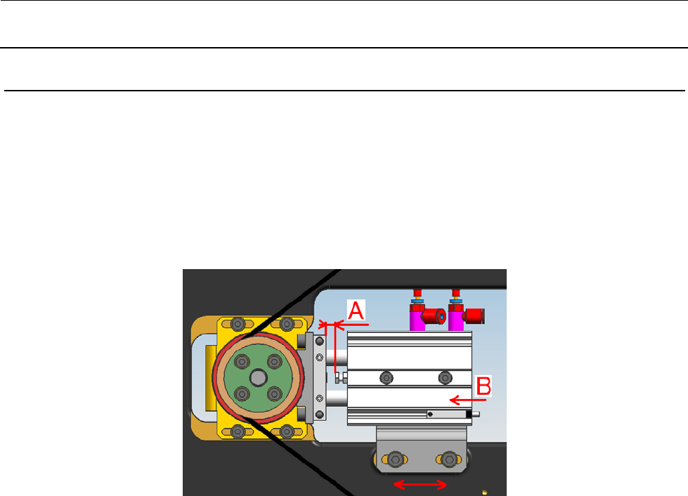 维修调整要领书 5- 28 5- 13 支承制动器的更换 1 ) 支承制动器的前后位置请确认, 当气动为 ON 状态时, 在支承制动器 (橡胶部) 碰到滚珠螺杆法兰 外周的状态下,图示的 A 尺寸为 5mm 。 2 ) 支承制动器的锁定传感器位置是,从气缸的后端一侧将传感器朝“ B 方向” 移动,变为 ON ( LED 亮灯)之后再移动 1mm ,在此位置上固定。 ※ 请一定要确认气缸动作时 LED 亮灯。 3 ) 速度控制器的调整 从…