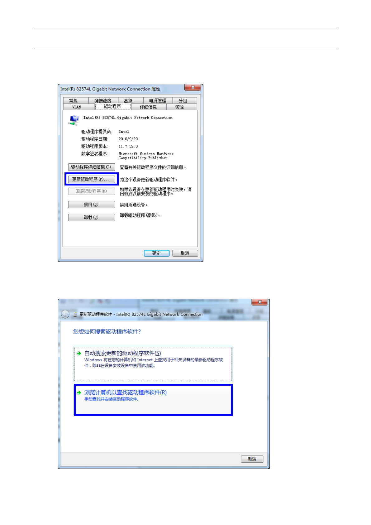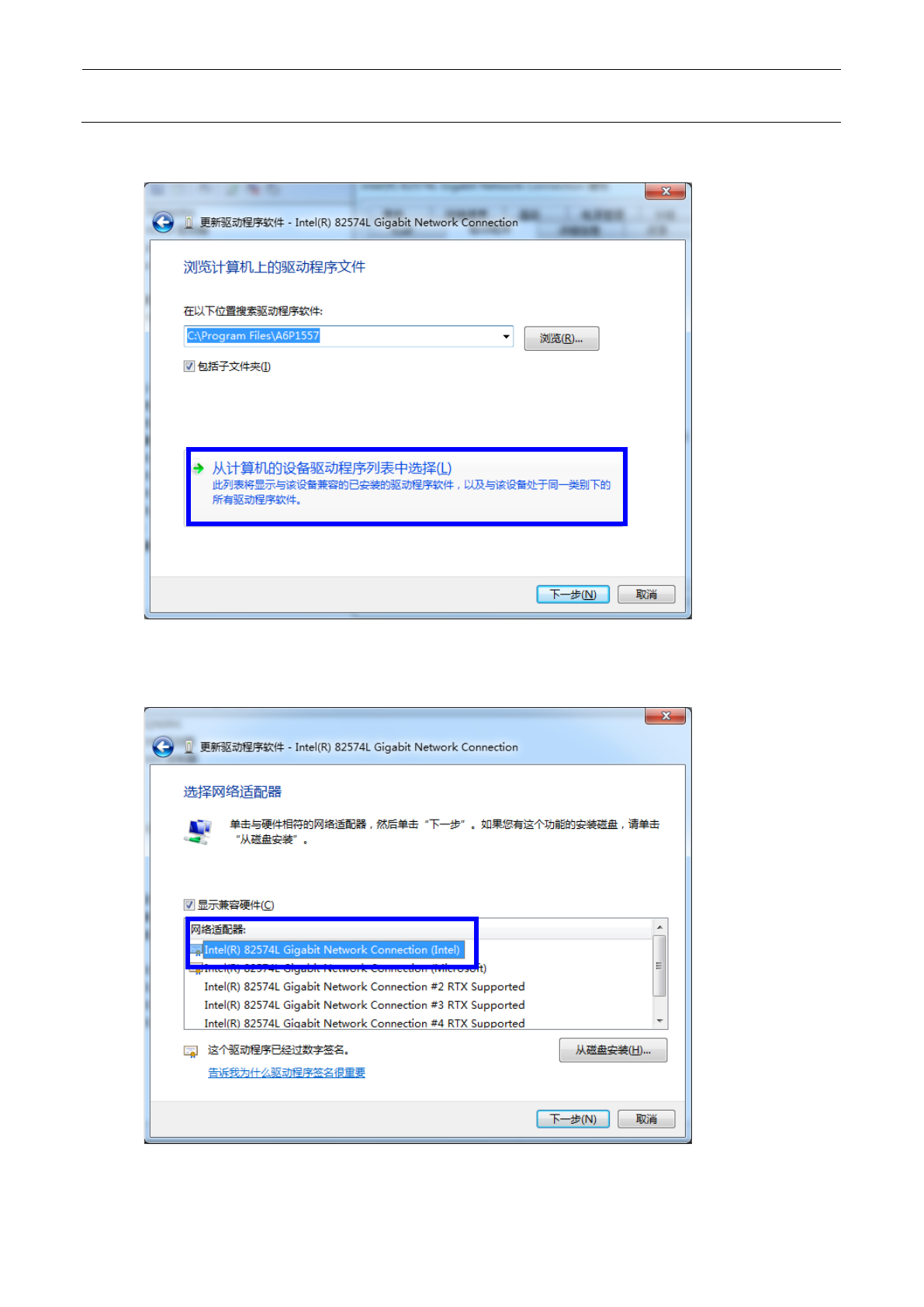 维修调整要领书 12 - 27 9 ) 选择“从计算机 的设备驱动程序列表中选 择( L )”。 10 ) 选择“ Intel(R) 825 74L G igabit Network Connection (Intel) ”。