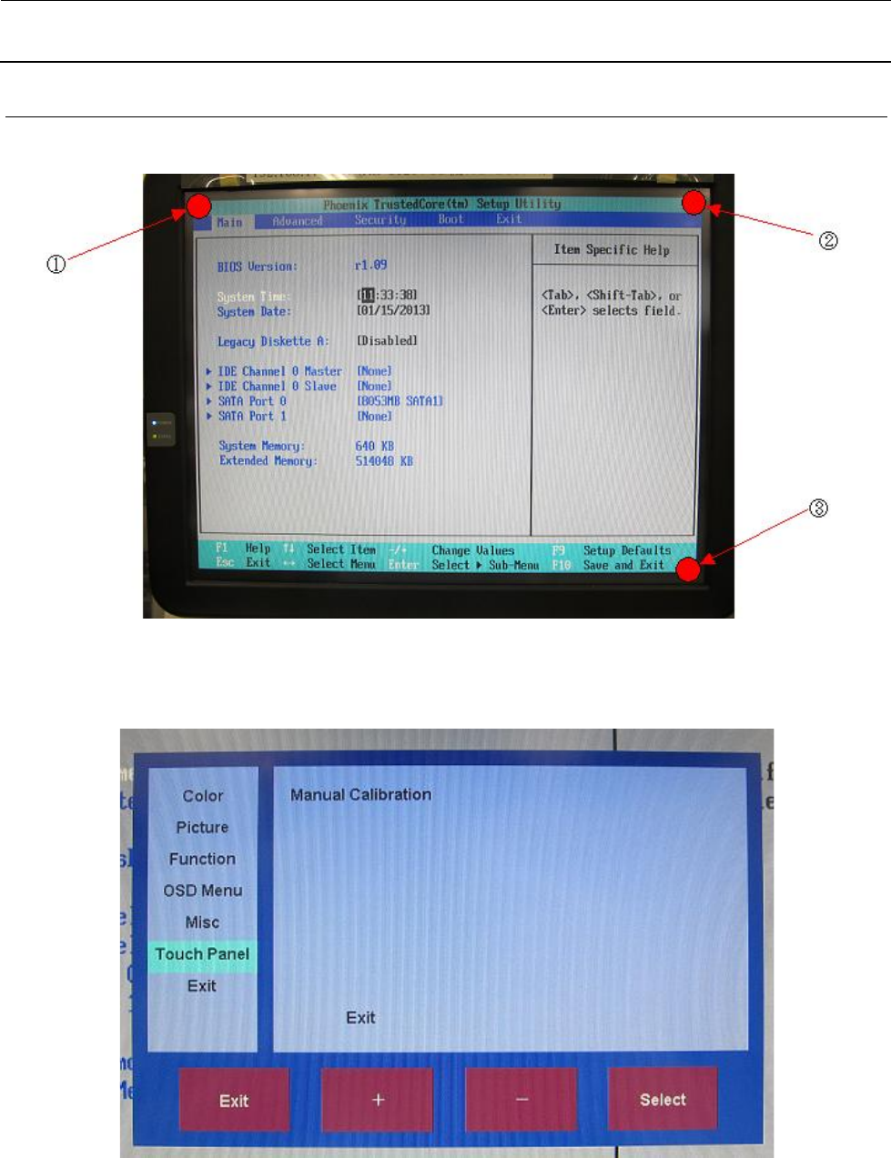维修调整要领书 13 -3 3 ) 接着操作 OSD 的“ Select ”,使光标移动至“ Manual Calibration ”。 4 ) 接着操作 OSD 的“ Select ”,画面左上方会显示“+”并开始校准。 画面左上角会显示“+”, 如触摸“+”的中心部分会发出蜂鸣器声音,请持续触摸直至蜂鸣器声音 停止。只要逐次点触“+” ,即会按照右上方→左下方→右下方的順序显示“+”,故每次都请点触 “+”中心部分。