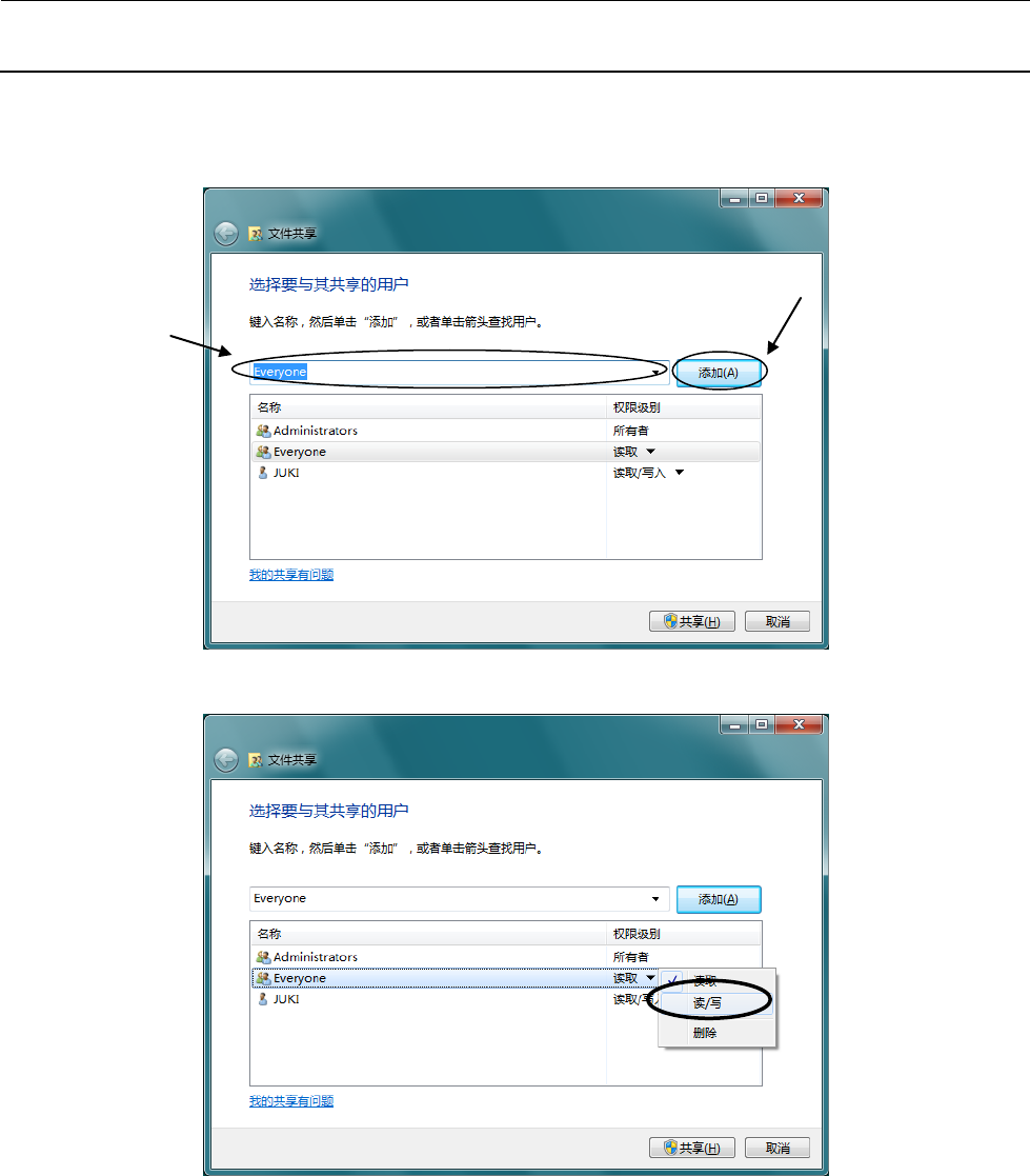维修调整要领书 13 - 23 6 ) 会显示 “文件共享” 对话框, 可打开①下拉框或利用直接输入, 在输入 了“ Everyone ” 的状态下 选择②“添加”。 7 ) 在上面的画面中, Everyone 的 [ 权限级别 ] 默认为“读取”,故请点击这一部分,选择“读 / 写”。 ① ②
