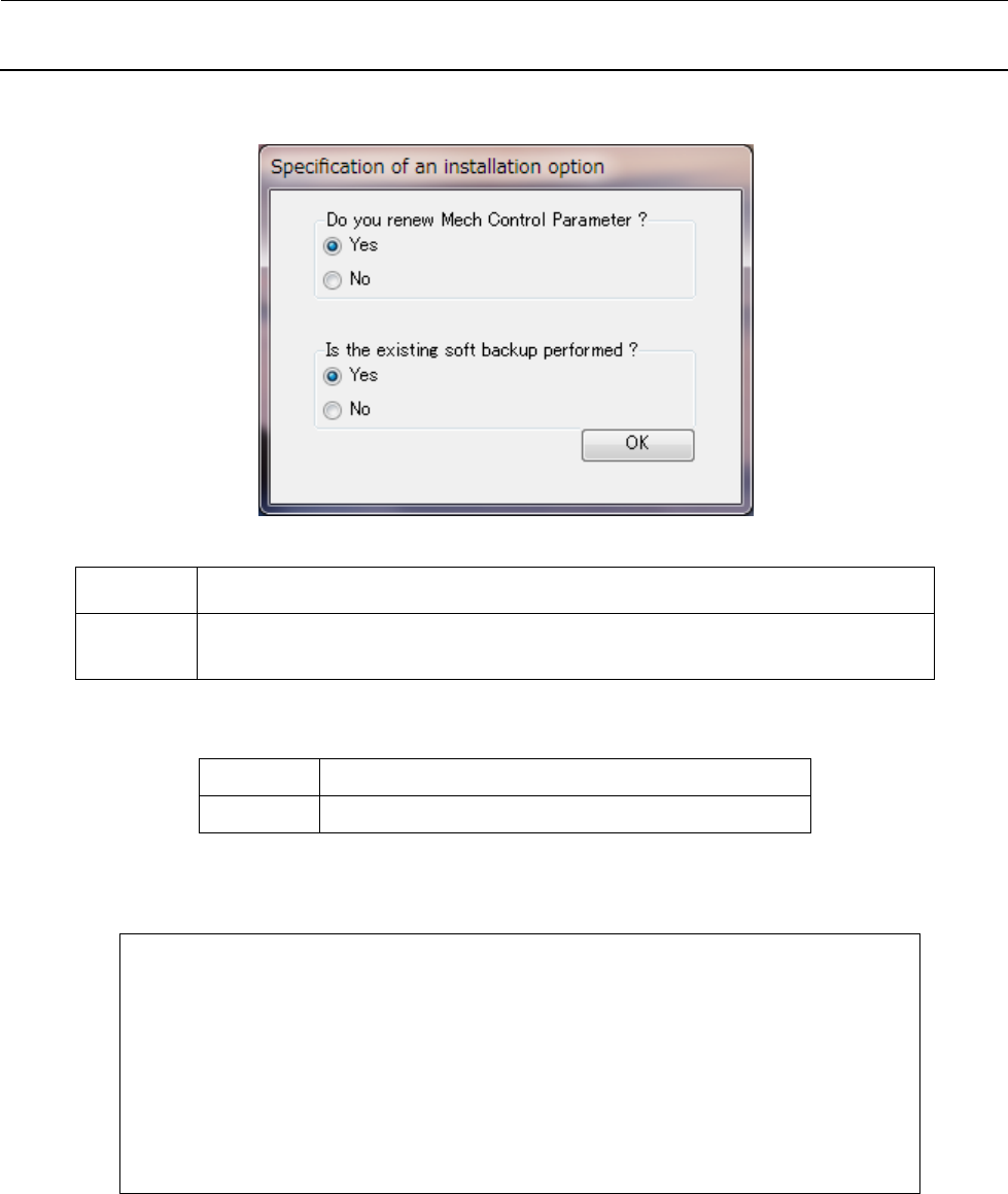 维修调整要领书 13 - 38 7 ) 显示机械控制参数初始化和现有软件的备份选择画面。 <机械控制参数的初始化>( Do you renew Mech Control Parameter ? ) Yes 机械控制参数被初始化,设置为默认值。 No 新版本的软件也继承机械控制参数的当前的设置值。 通过版本升级,只有新需要的数据被设置为默认值。 <现有软件的备份>( Is the existing soft backup performe…