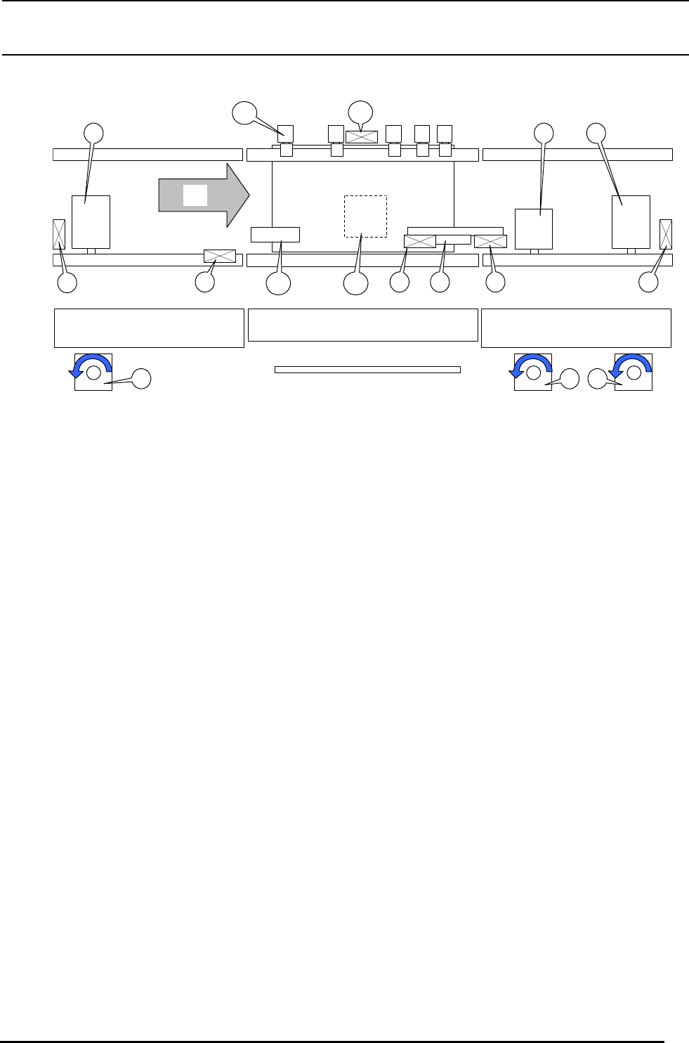 R e v 2 . 0 0 动作说明书 3- 5 3-2 基板传送 1. IN 马达 ( 步进马达 ) 2. CENTER 马达 ( 步进马达 ) 3. OUT 马达 ( 步进马达 ) 4. IN 传感器 5. WAIT 传感器 6. STOP 传感器 7. C・OUT 传感器 8. OUT 传感器 9. 止动器 10.X 推进器 11. Y 推进器 12. BU 马达 ( 步进马达 ) 13. BU 原点传感器 A 1 1 3 3 2…