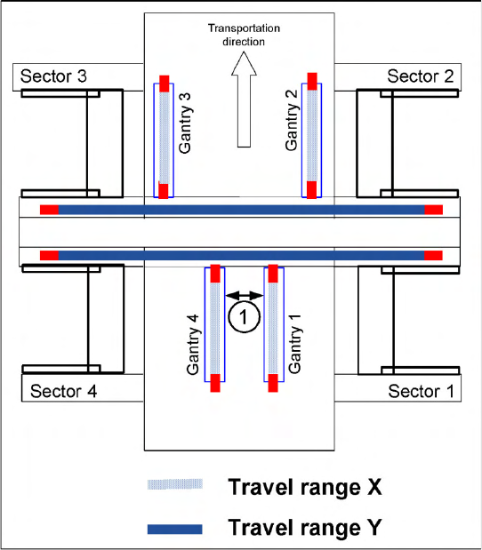 2. In placement areas 1 and 2, gantry 1/2 moves