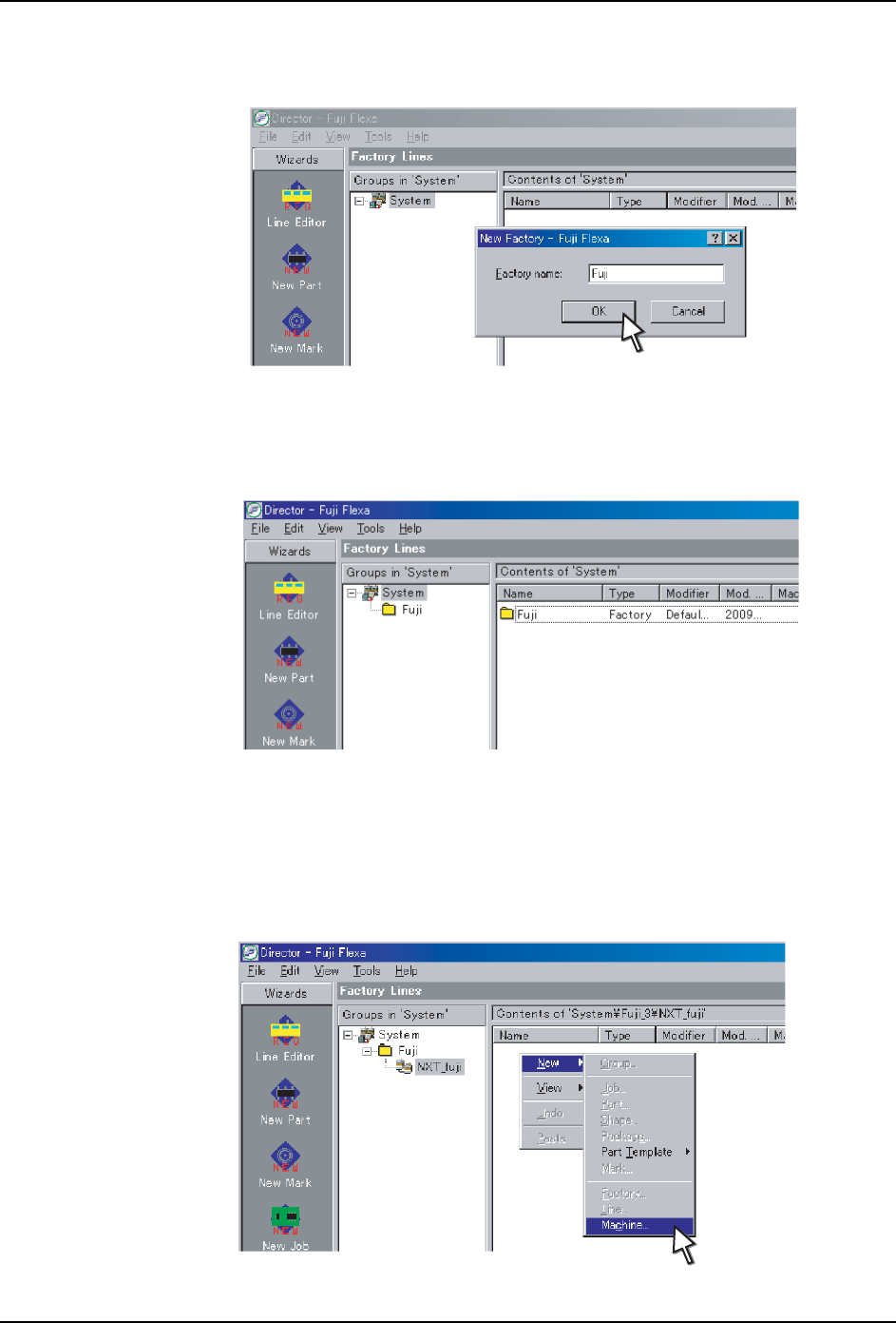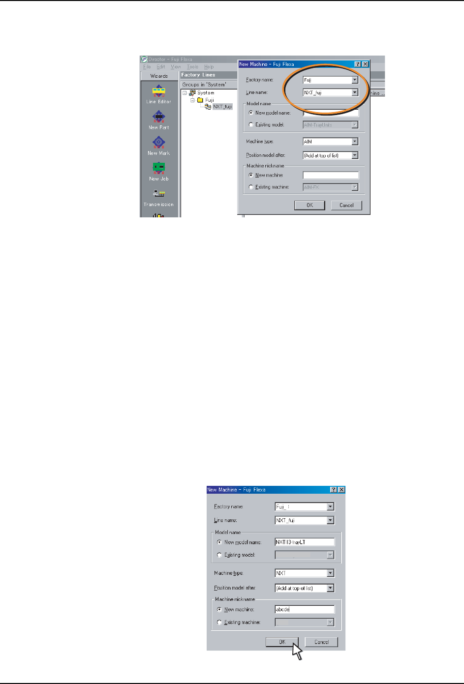 QD139-03 4. 在 FUji Flexa 中设定 NXT-2 NXT II 安装手册 63 2. 工厂名、生产线名显示在 [ 新建机器 ] 对话框上 部。请确认名称是否正确。如果有误 , 则需从下拉菜单中选择正确的名 称。 3. 如果在服务器的设置中,选中 [ 显示生产线信息的模型名称 ],则需在 “模型名称”中 输入该机器的模型名称。 这用于决定能否向某 台机器传输 Job。 若模型名称与任务内的机 器名称不同,则无法传输。如…