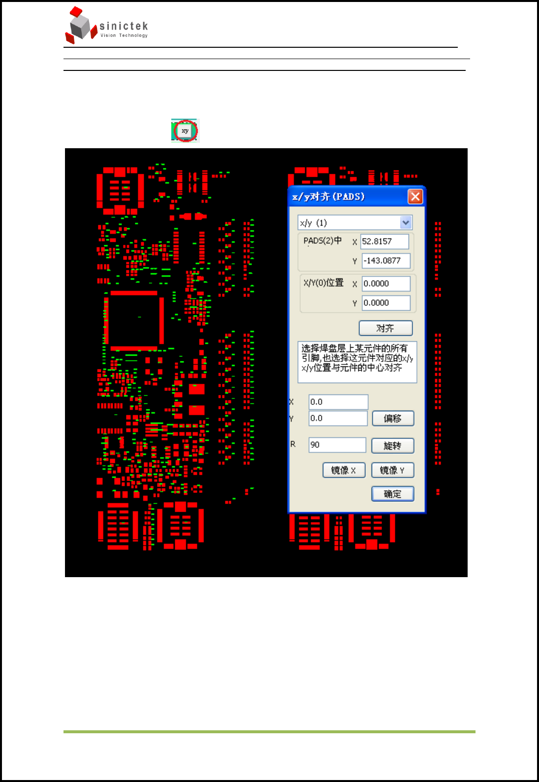 InSPIr e-Series 操作手册 思泰克光 电科技有限 公司 14 / 83 Copyrigh t by Sini c-T ek V ision T echnol ogy Co., L td. CopCop 当 X/Y 数据和 Gerber 方向一致时,框选中单个 X/Y 数据和其对应的焊盘,如下 图 : 选中后 X/Y 数据会有白色的十字线, 而其对应的焊盘变成白色。 在下图中会显示 X/Y 数据坐标和焊盘中心位置坐标。