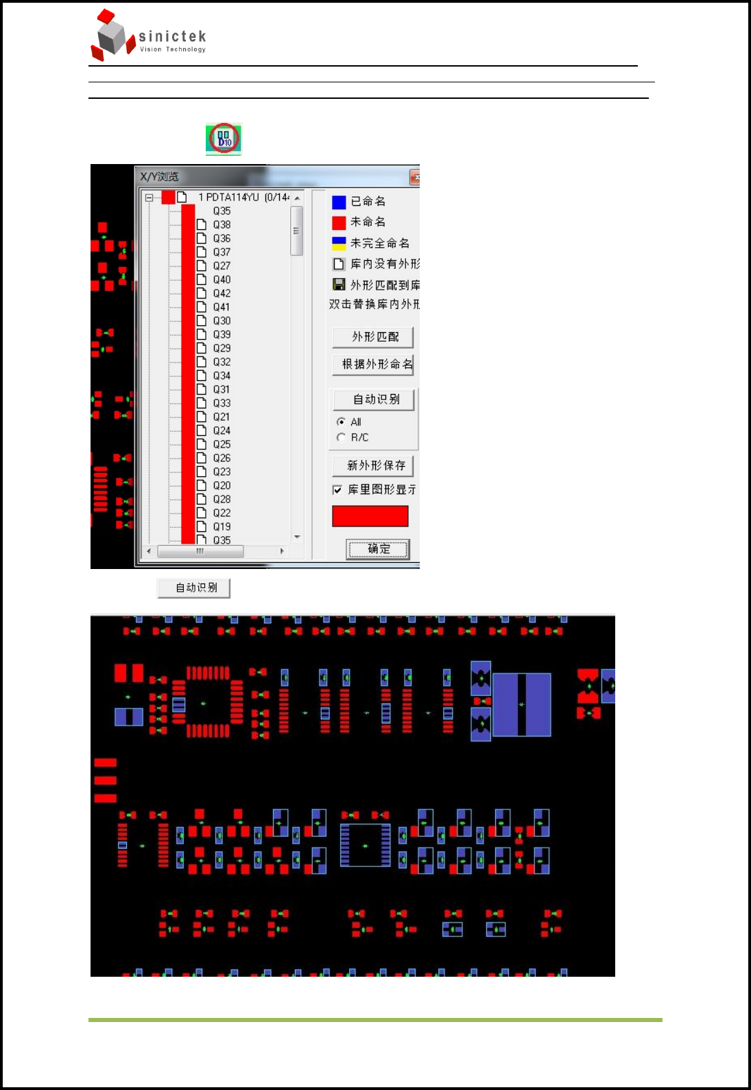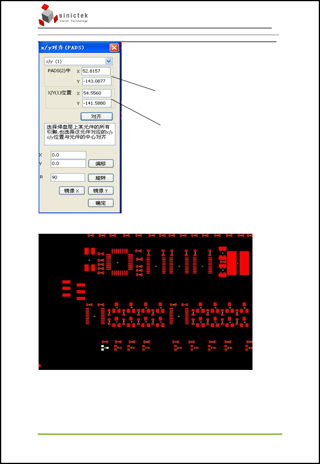 InSPIr e-Series 操作手册 思泰克光 电科技有限 公司 15 / 83 Copyrigh t by Sini c-T ek V ision T echnol ogy Co., L td. CopCop 位置坐标 当有焊盘中心位置坐标和 X/Y 数据坐标后选择确定 这时我们会发现所有的 X/Y 数据和焊盘都对应上了。 焊盘中心 X/Y 数 据坐标