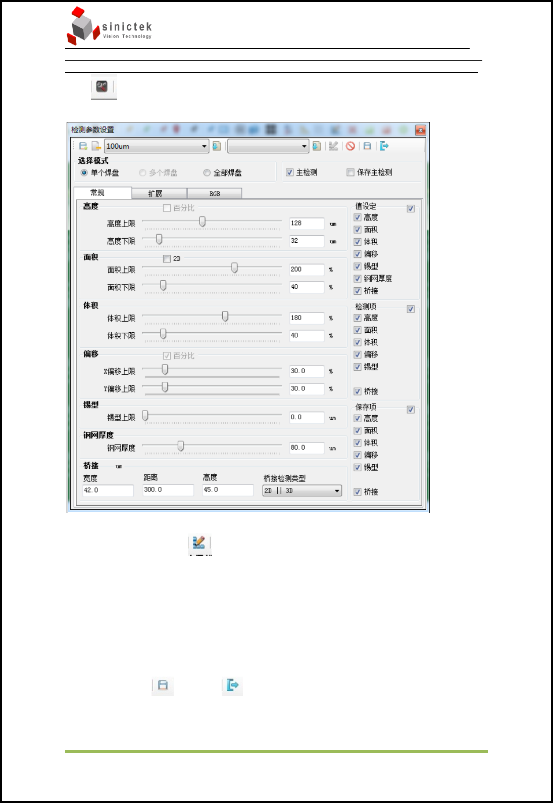 InSPIr e-Series 操作手册 思泰克光 电科技有限 公司 22 / 83 Copyrigh t by Sini c-T ek V ision T echnol ogy Co., L td. CopCop 点击 出现检测参数设置界面 选择全部焊盘,并点击 ,点击后右侧变为可修改 选中右侧值设定中的项目左侧对应的变为可修改, 然后可以设置选中项目的参数 参数设置完毕后,在检测项中选择检测时需要检测的内容。 保存项中选择相应的项目…