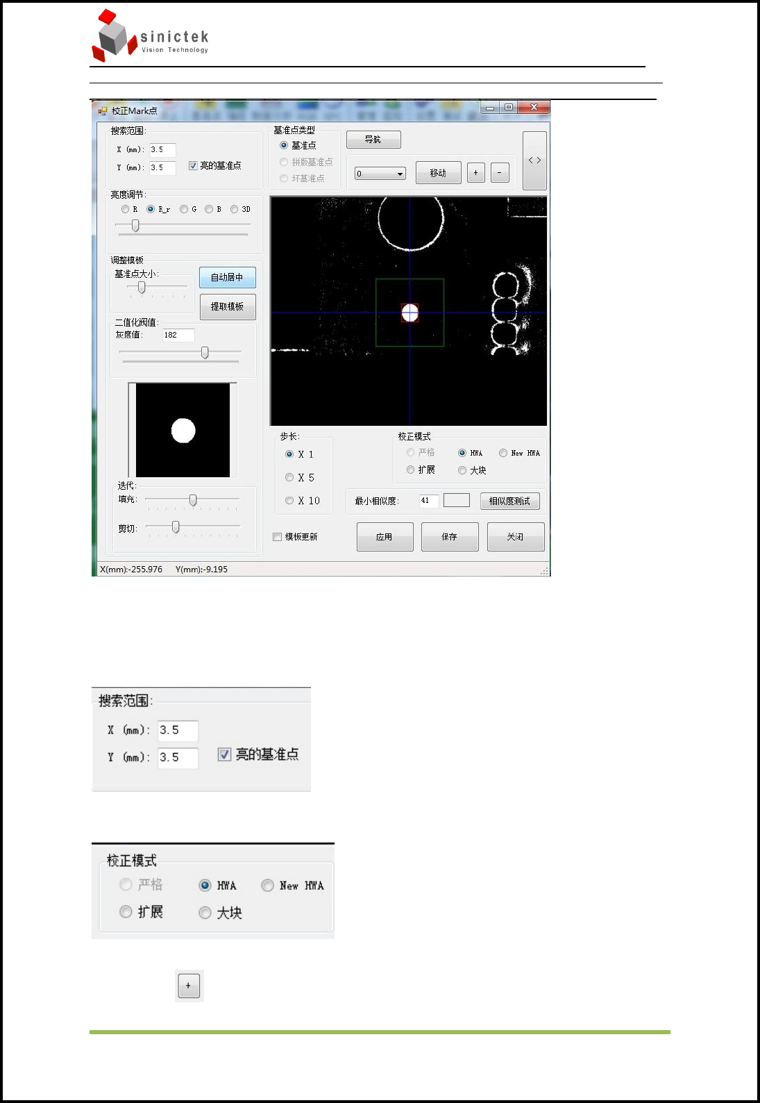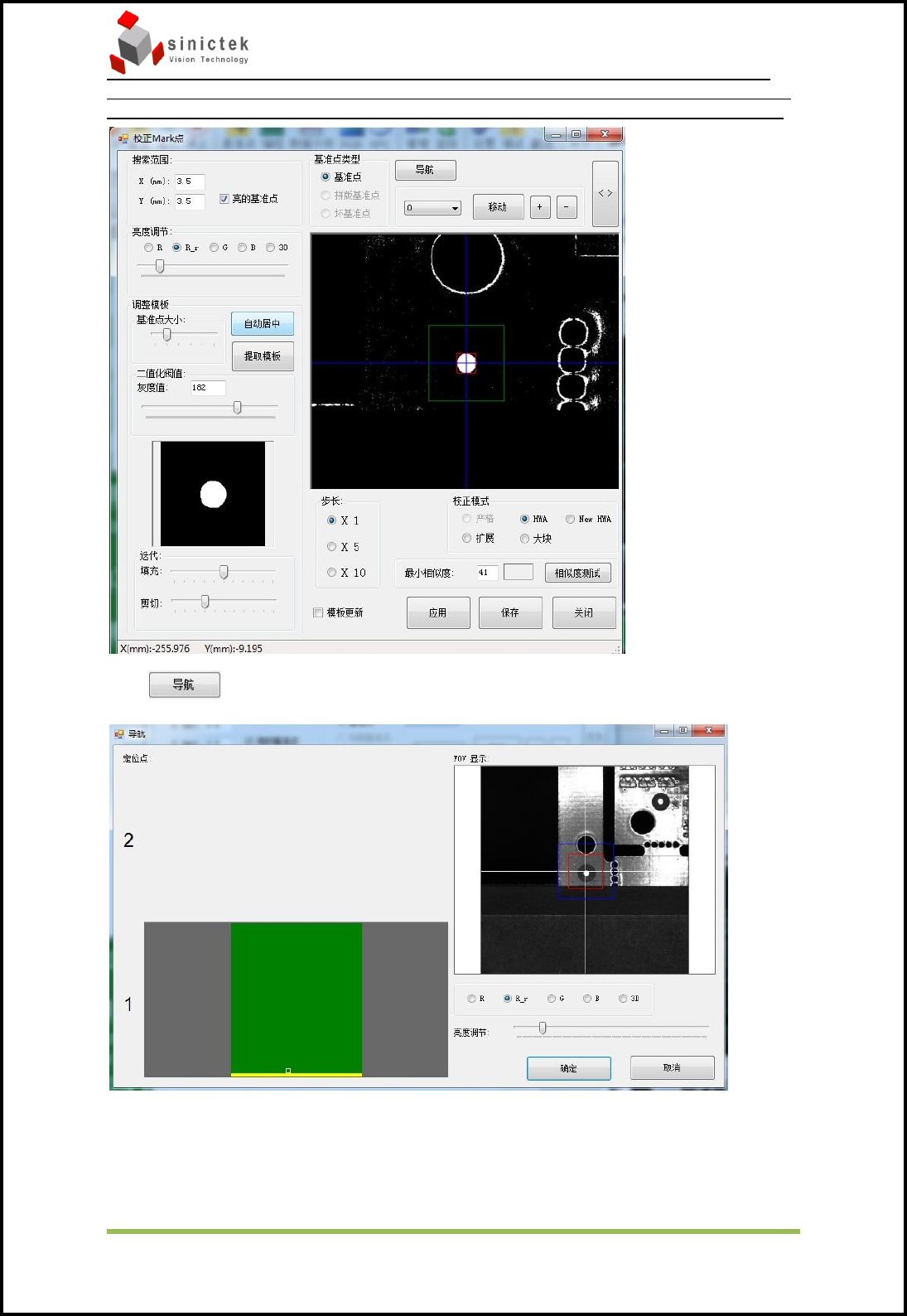 InSPIr e-Series 操作手册 思泰克光 电科技有限 公司 28 / 83 Copyrigh t by Sini c-T ek V ision T echnol ogy Co., L td. CopCop 左击一下右侧图像,图像会更新 在亮度调节中选择合适的光源 ( R : 红光; R_r : 顶光; G :绿光; B : 蓝光) 和亮 度, 调整二值化阀值里的灰度值让 Mark 点图像清楚, 然后选择自动居中让红色框 与 M…