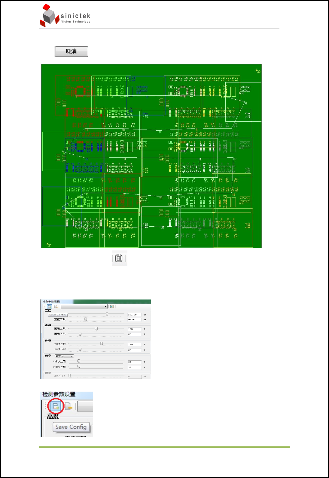 InSPIr e-Series 操作手册 思泰克光 电科技有限 公司 46 / 83 Copyrigh t by Sinic-T ek V ision T echn ology Co., L td. CopCop 选择后跳出配置保存画面 输入配置名称(通常以钢网厚度命名)选择保存 通过下拉菜单选择需要调用的配置 删除选择中的配置 导入选择中的配置。 分组功能如下: 新建,删除,查找