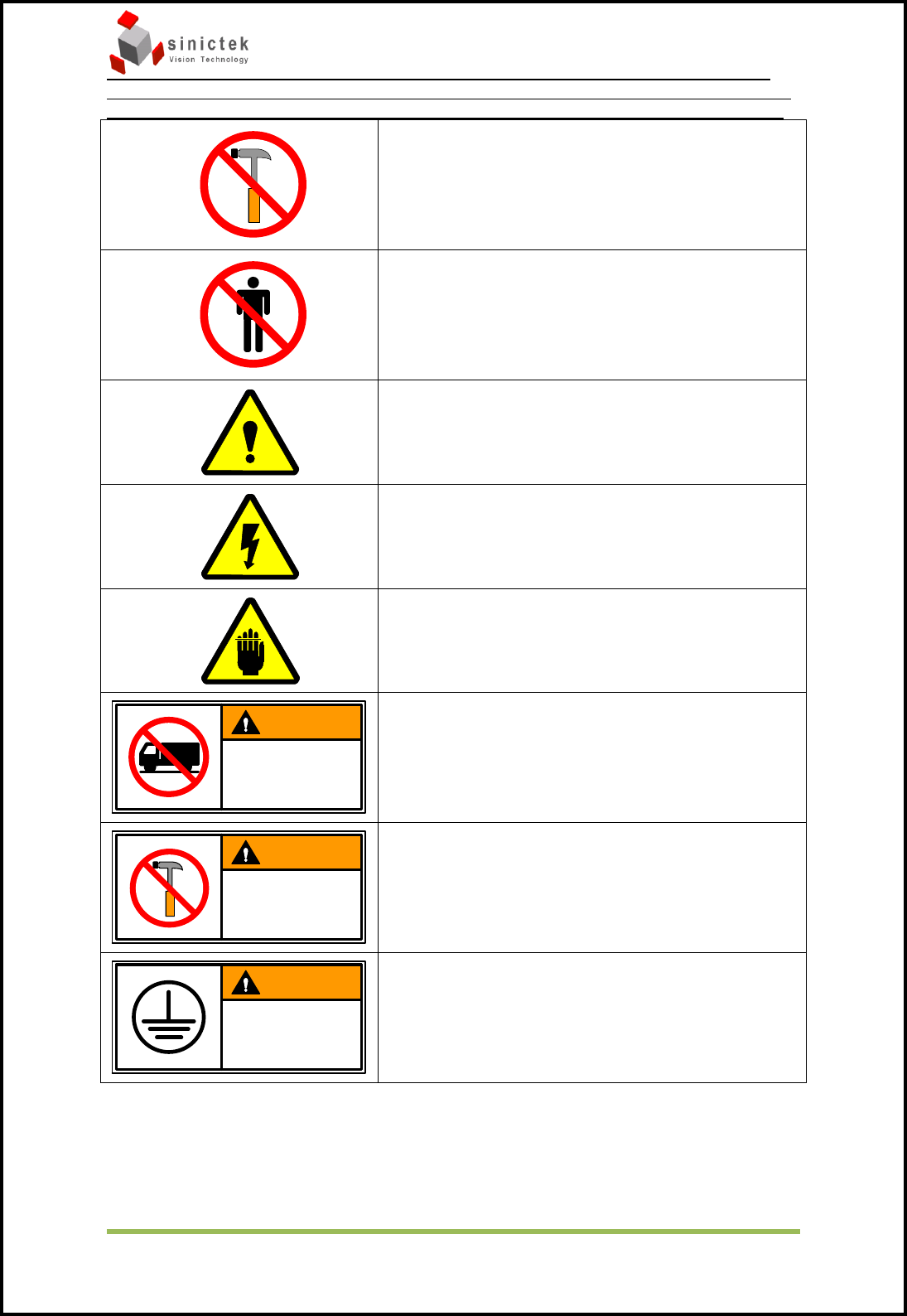 InSPIr e-Series 操作手册 思泰克光 电科技有限 公司 5 / 83 Copyri ght by Sinic-T ek V ision T echnolo gy Co., L td. CopCop DA NGE R There is danger of an electric shock. During maintenance, make sure that main power is turned off. 危险: 在对…
