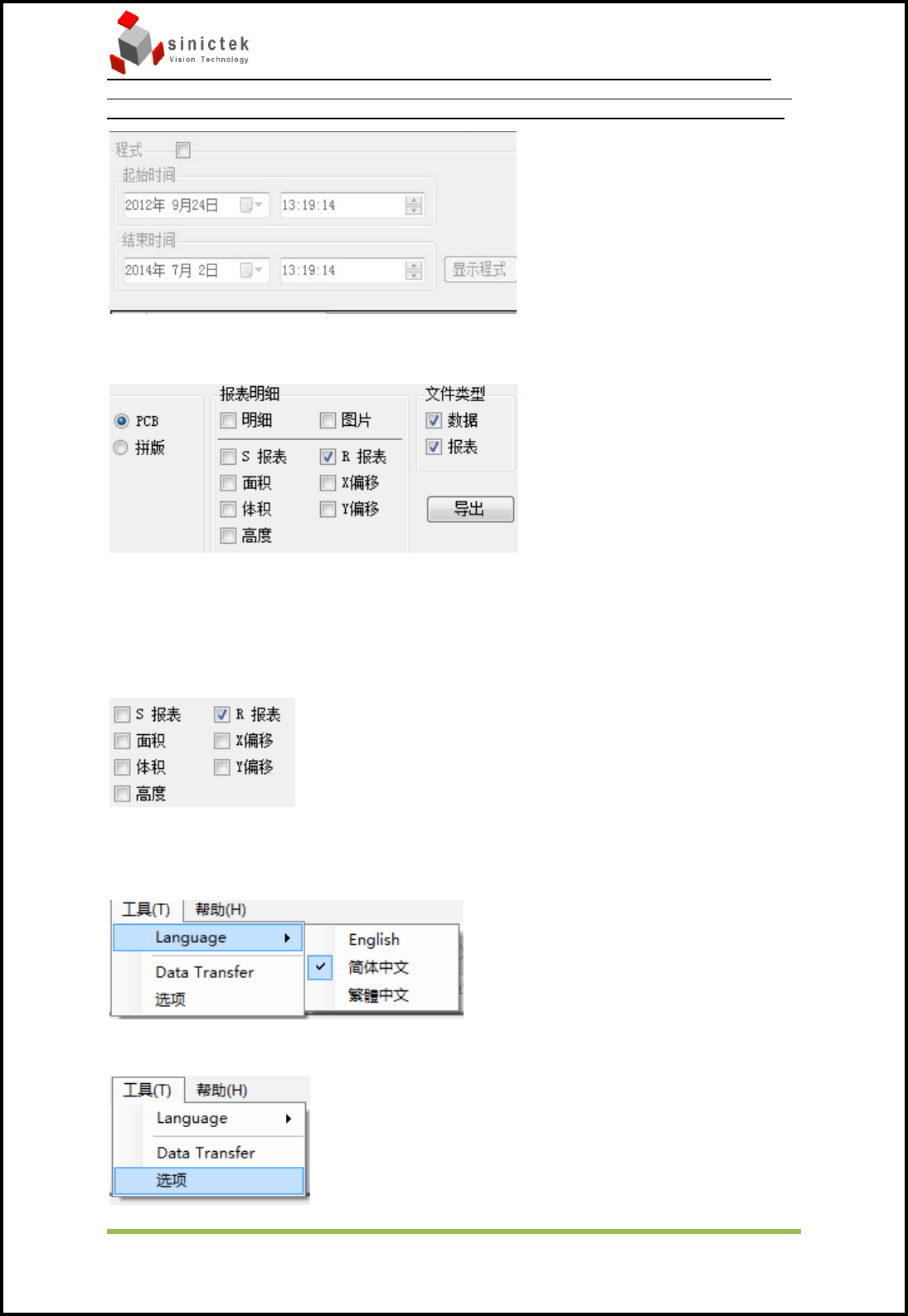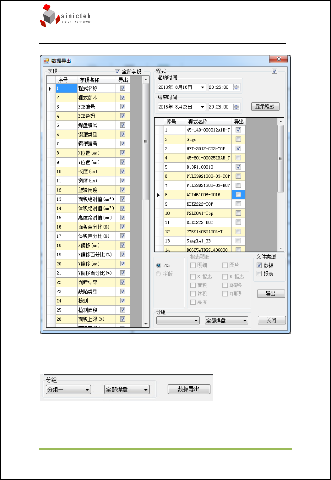 InSPIr e-Series 操作手册 思泰克光 电科技有限 公司 64 / 83 Copyrigh t by Sinic-T ek V ision T echn ology Co., L td. CopCop 5.3.8 数据导出 数据导出: 可以通过设定相应的时间与程式, 导出对应的数据, 报表, 以及详细 的明细与 X-Bar 图 R 图不良图片等数据。 选择导出报表的字段 分类导出数据