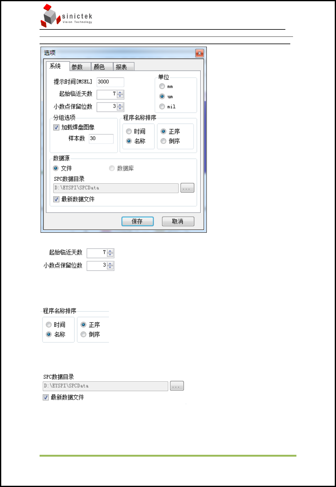 InSPIr e-Series 操作手册 思泰克光 电科技有限 公司 67 / 83 Copyrigh t by Sinic-T ek V ision T echnology Co., L td. CopCop 5.4 设置 5.4.1 检测 数据保存:勾上后保存测试数据,否则不保存。 图像: 选择全部, 保存所有图像; 选择不良, 只保存测试不良的图像; 选择良好, 只保存良好的图像。