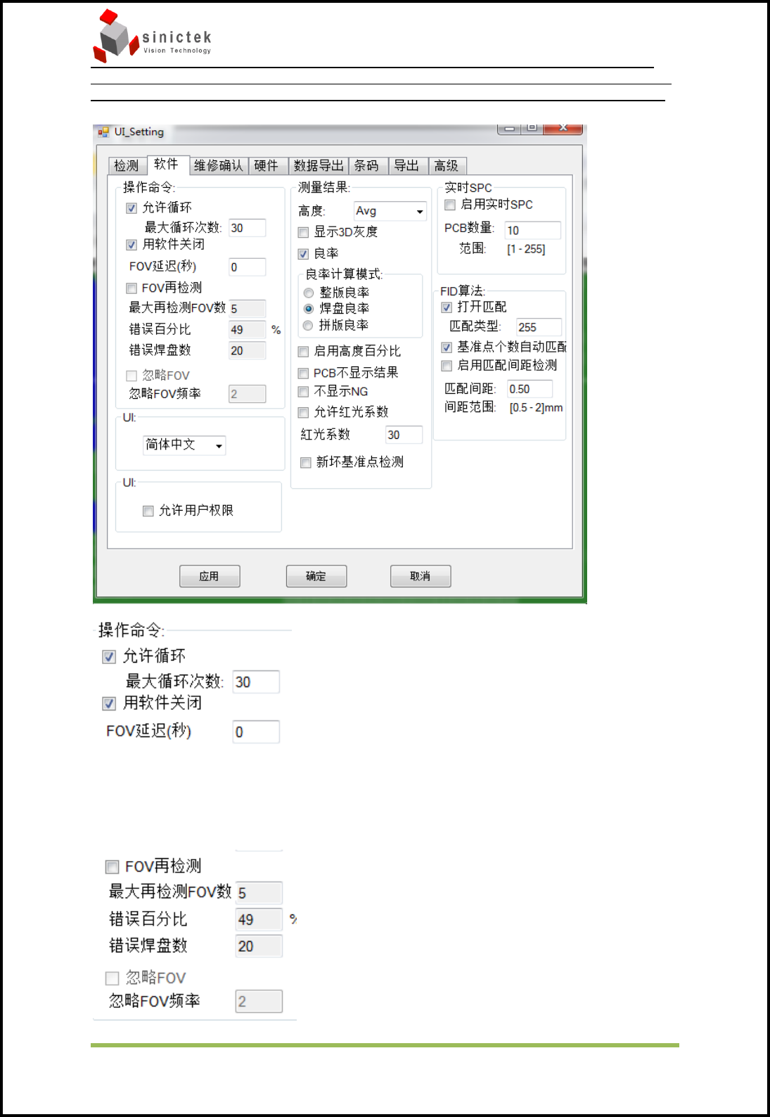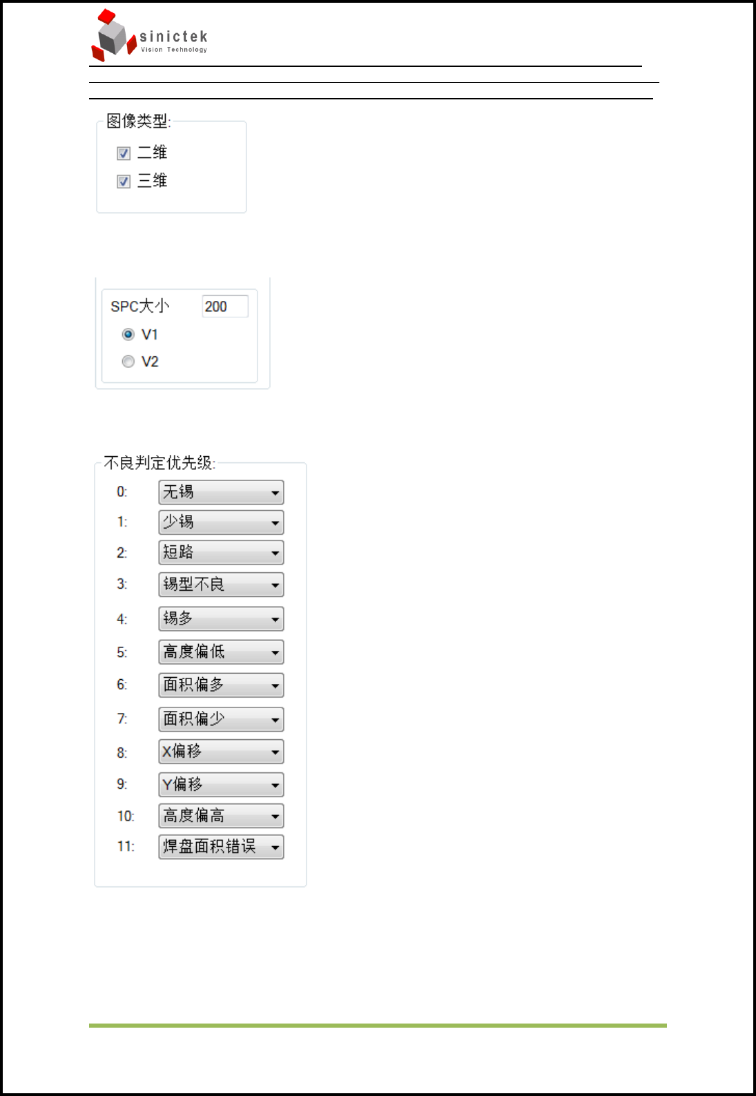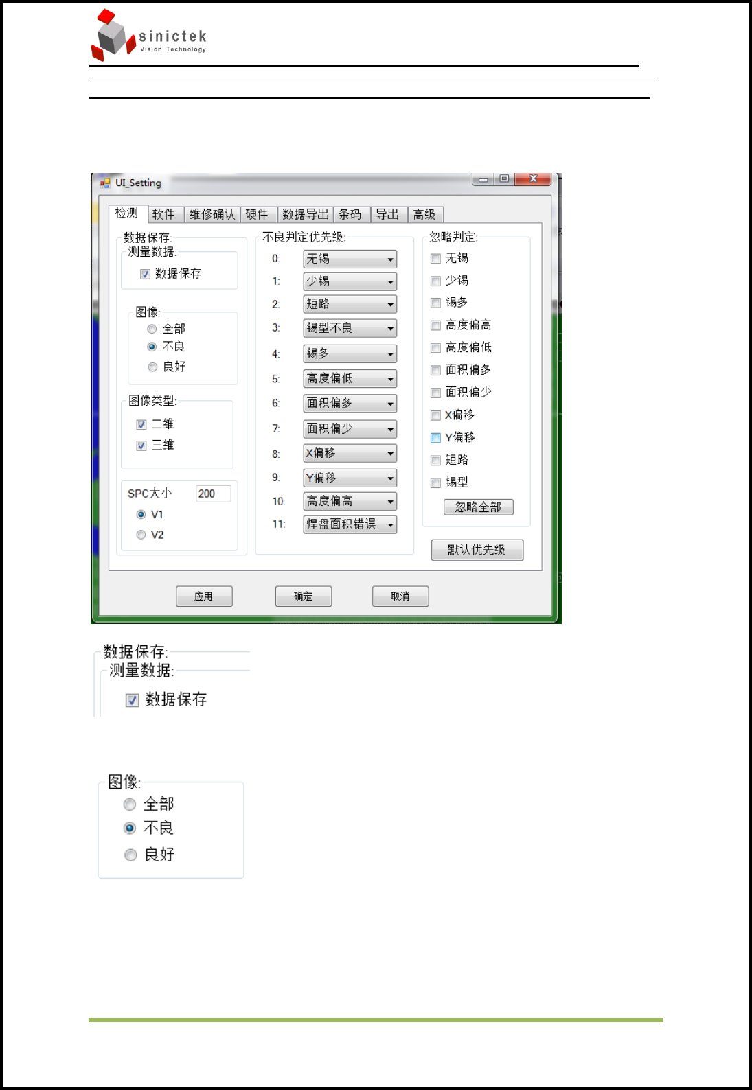 InSPIr e-Series 操作手册 思泰克光 电科技有限 公司 68 / 83 Copyrigh t by Sinic-T ek V ision T echnology Co., L td. CopCop 图像类型:保存二维或者三维图像。 SPC 文件的大小:单位为 MB ,默认是 200 , V1 为老版数据库, V2 为新版数据库 不良判定优先级: 当一个检测框同时报多个错误时, 会优先显示优先级最高的错 误名。 当不选某一个…