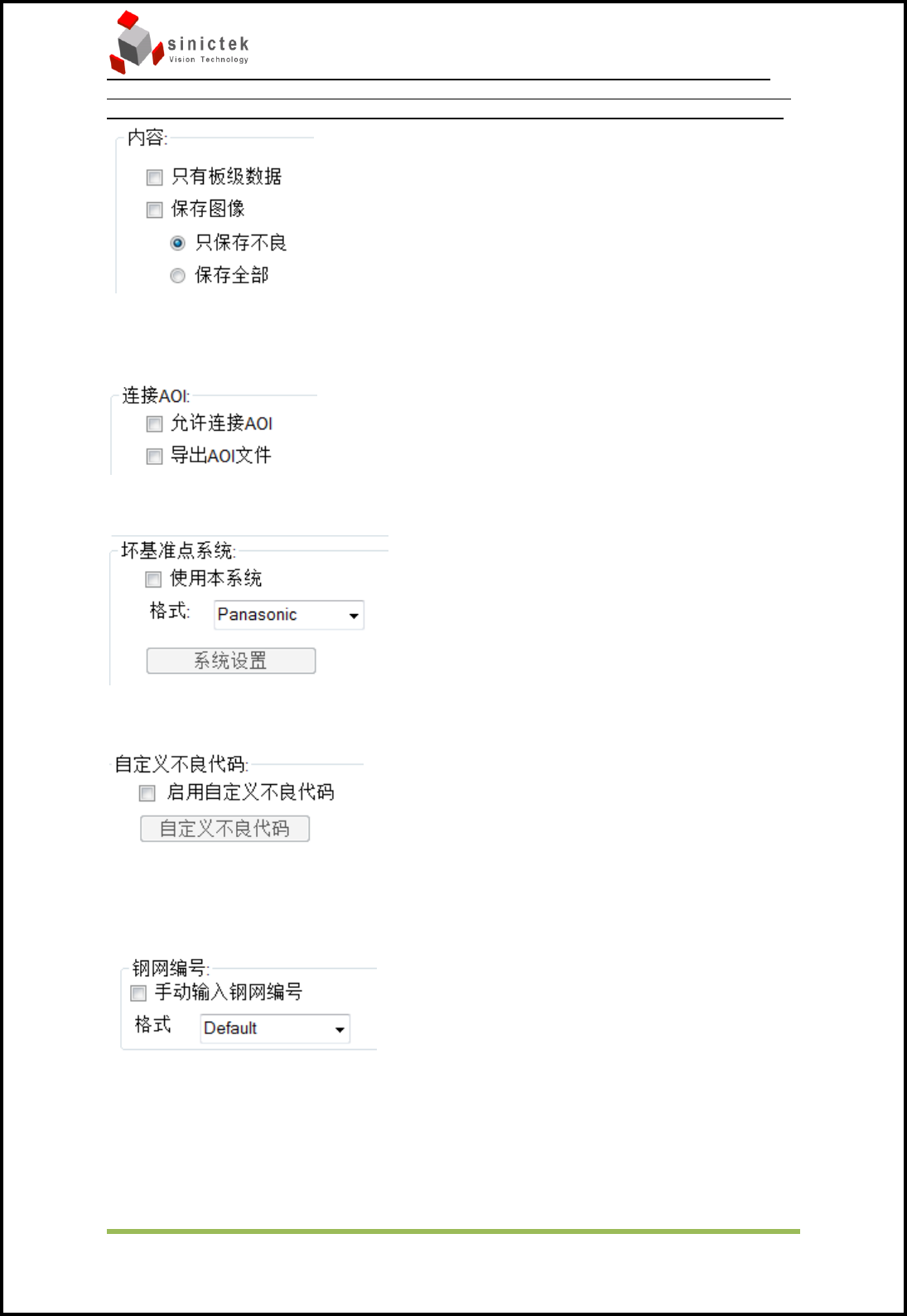 InSPIr e-Series 操作手册 思泰克光 电科技有限 公司 77 / 83 Copyrigh t by Sinic-T ek V ision T echnology Co., L td. CopCop 只有板级数据:数据导出只有整板数据,没有单个 PAD 的数据 保存图像:是否保存图像 连接 AOI :配合 link to AOI 软件 实现三点照何功能。 坏基准点系统:启用后可以输出坏基准点的文件给相应的贴片机。 自定义不良…