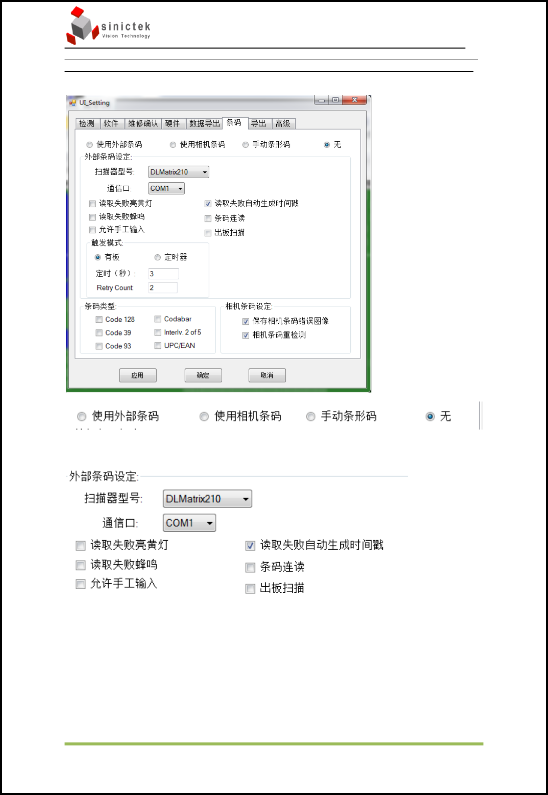 外部条码设定:选择外接式条码枪的型号,目前支持 Datalogic 的 Matrix210