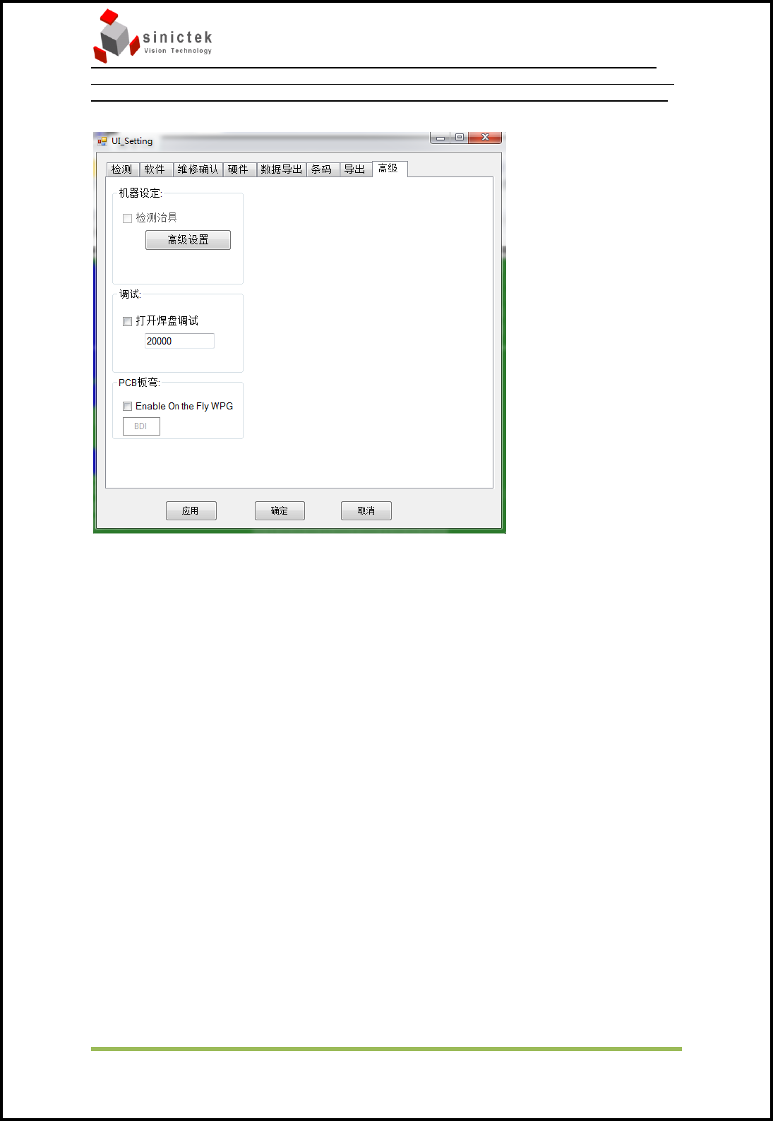 InSPIr e-Series 操作手册 思泰克光 电科技有限 公司 80 / 83 Copyrigh t by Sinic-T ek V ision T echnology Co., L td. CopCop 5.4.8 高级 调试:输入 PAD ID 把对应的测试数据保存在 debug 文件夹中。 PCB 板弯:开启 PCB 板弯补偿功能。