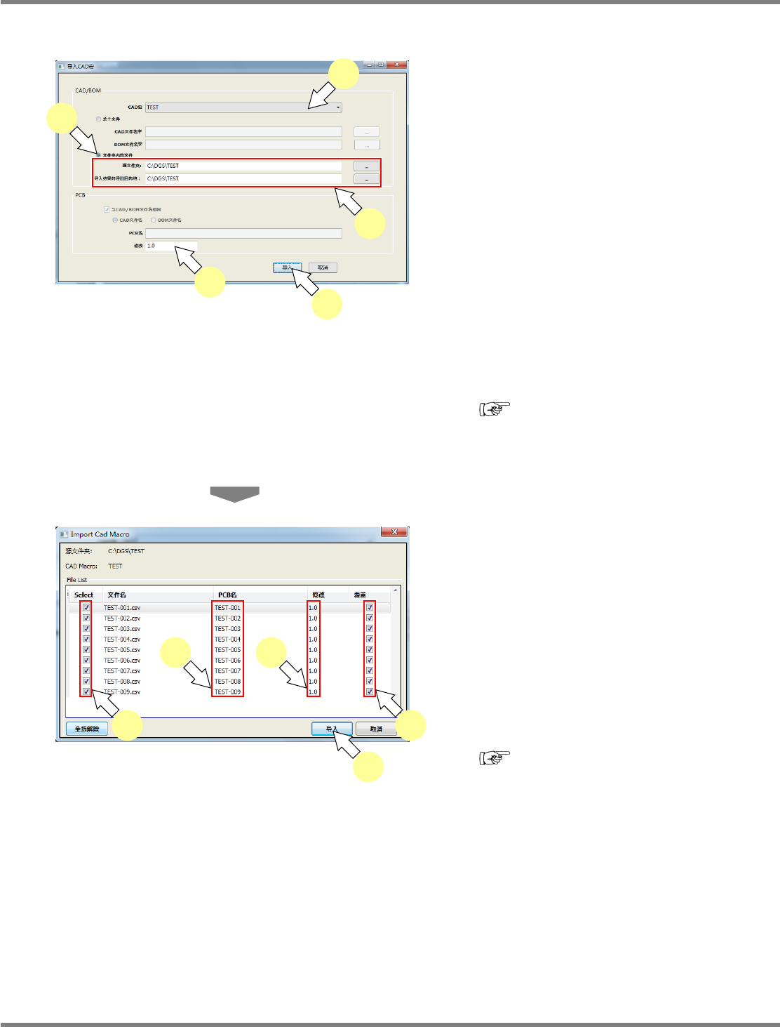 NPM-DGS 程序手册 5.4 CAD 宏的导入 EJS9AC-MB-05P-31 Page 5-115 ( 补充 )CAD/BOM 文件导入 选择文件夹内文件时的操作 1 选择所需使用的已定义宏。 2 选择 [ 文件夹内的文件 ] 。 3 指定保存 CAD 文件的文件夹,以及读 取结果的输出处。 4 输入修改内容。 不能使用下述文字。 % , ” ’ 空格 \ : ; / . < > ? * | 全角文字 PCB…