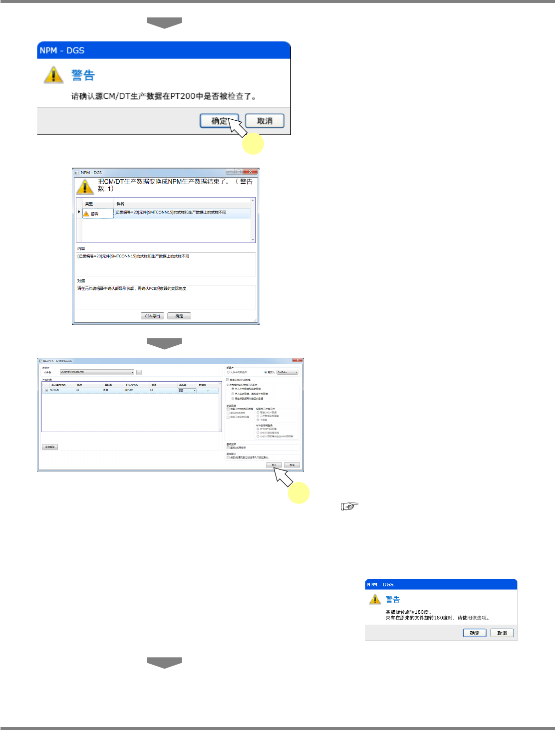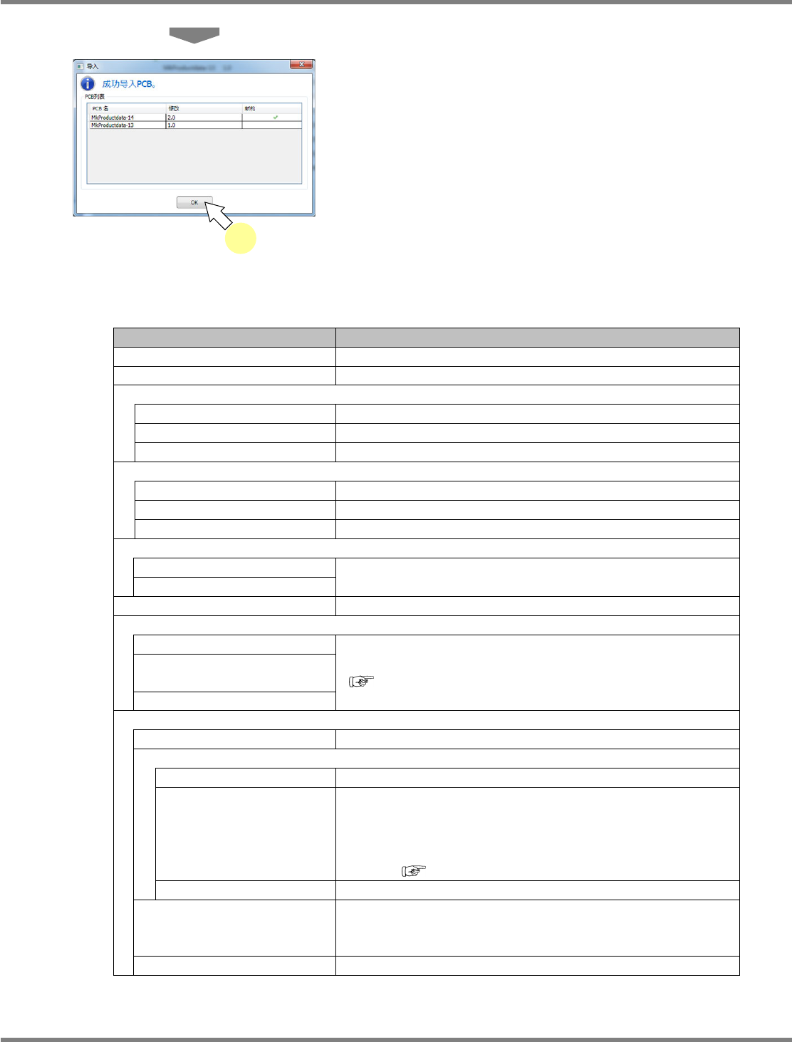 NPM-DGS 程序手册 5.6 生产数据的 PCB 导入 Page 5-126 EJS9AC-MB-05P-31 7 点击 [OK] 。 在 PCB 列表中, ‘ 新的 ’ 栏被勾选的项目属于新 建 PCB 。 当同时导入元件数据时,将显示元件 列表。在 元件列表中, ‘ 新的 ’ 栏被勾选的项目属于新建 元件。 P C B 导入的设定项目 项目 说明 文件名 显示所选择文件的名称。 复选框 请选择执行导入的 PCB 。初…