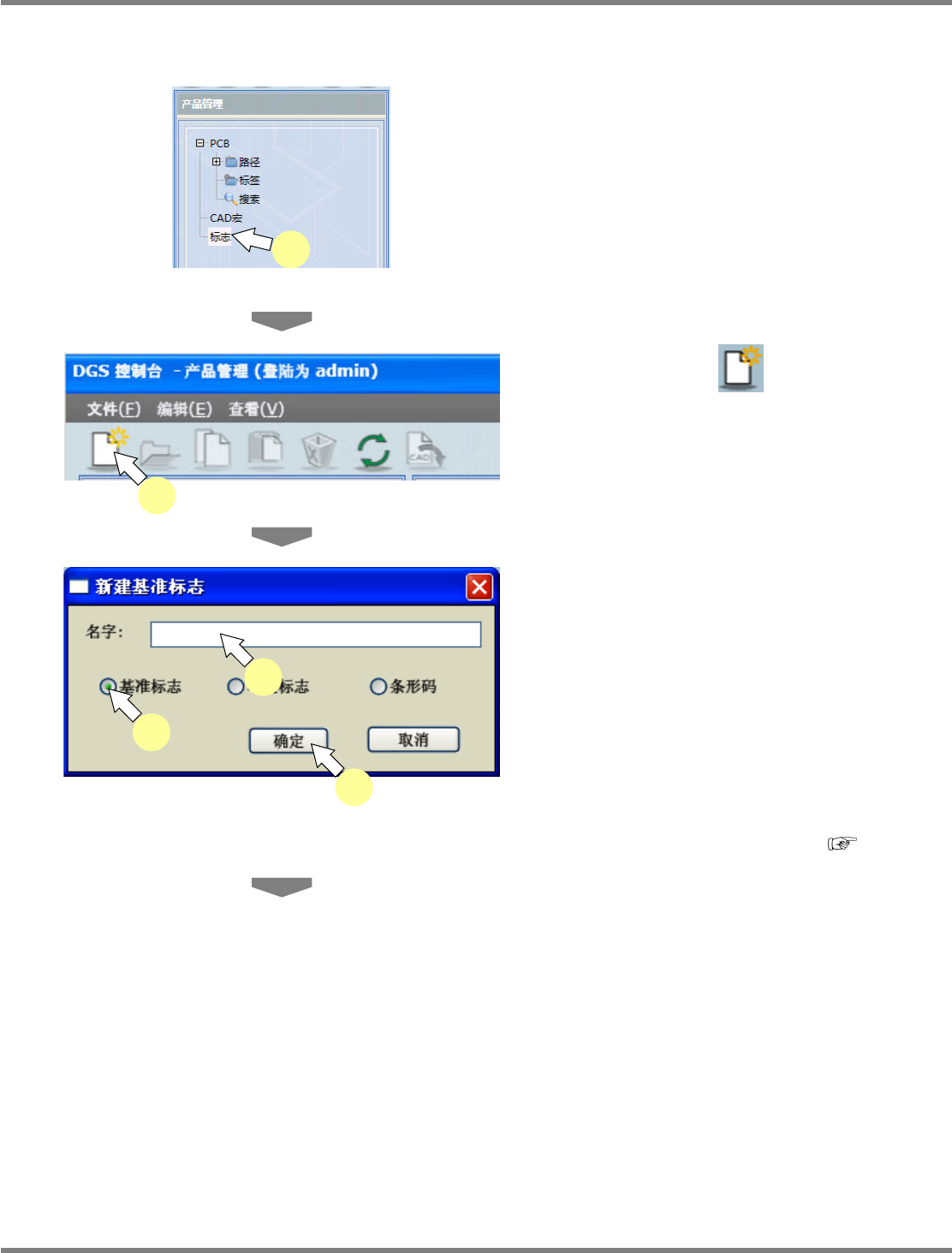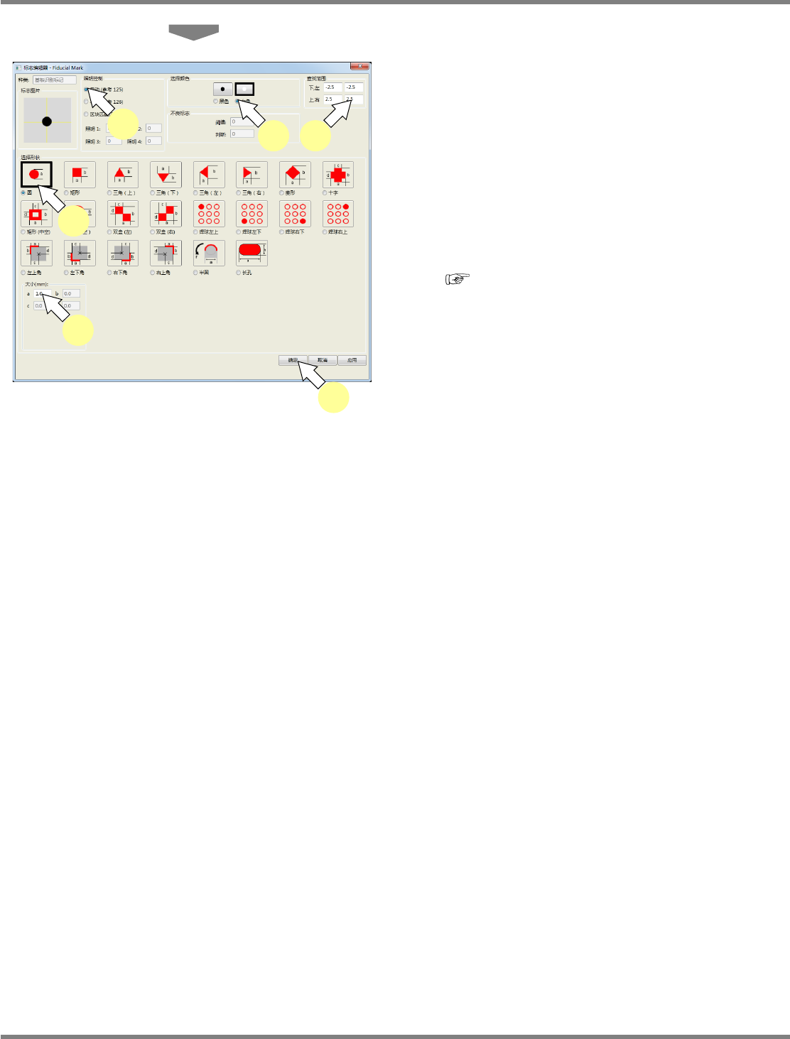 NPM-DGS 程序手册 5.7 标记的设定 Page 5-134 EJS9AC-MB-05P-31 6 在 ‘ 选择形状 ’ 中选择形状。 7 在 ‘ 大小 ’ 栏中输入形状的大小。 8 在 ‘ 灯泡控制 ’ 中选择基板标记的识别模 式。 选择手动时,请输入照明值。在通常 状态下, 在设备上进行照明值的示教,然后决 定。 ( 详细内容,请参照设备使用说明书。 ) 9 在 ‘ 选择颜色 ’ 中选择标记的颜色。 标记的颜色比周边的…