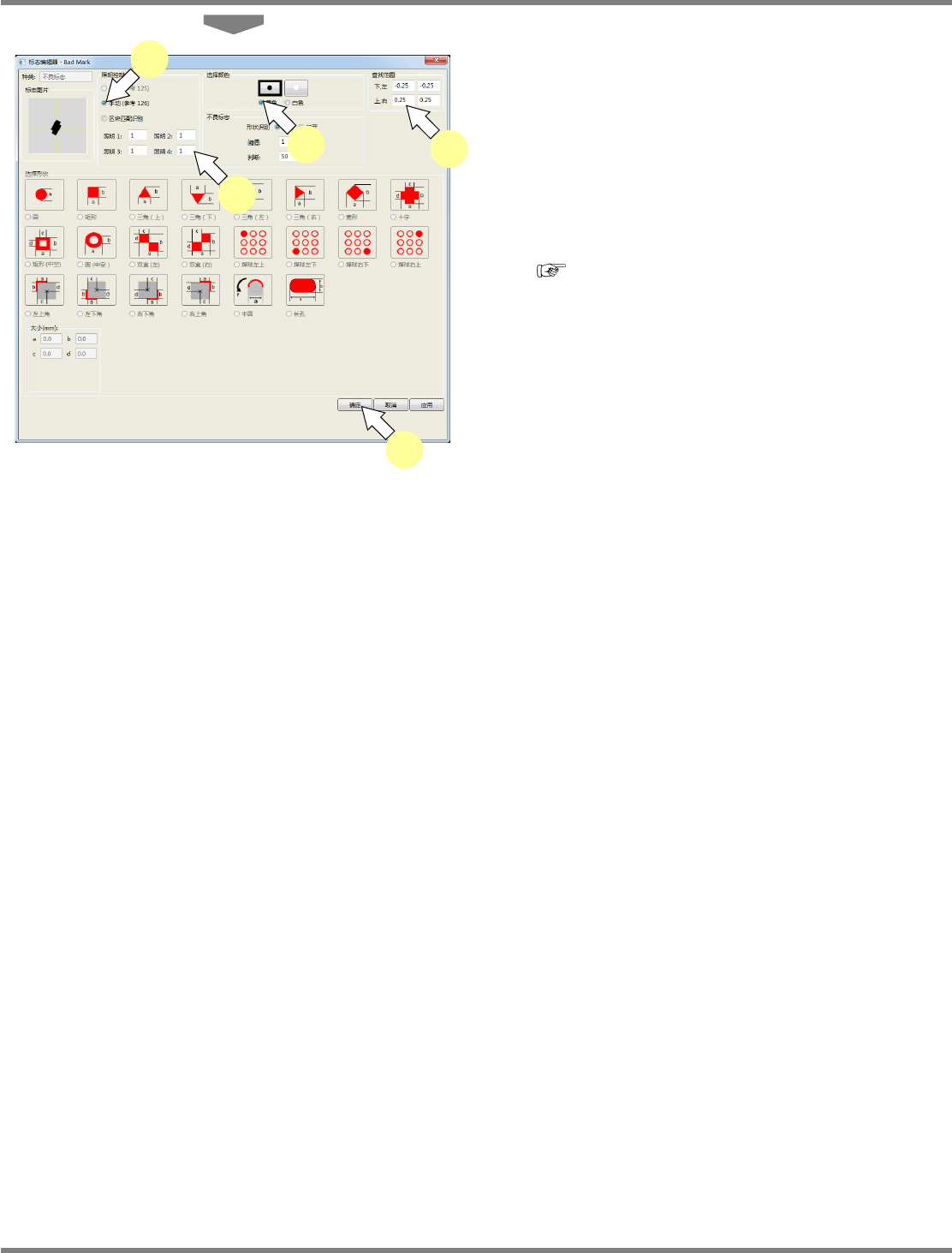 NPM-DGS 程序手册 5.7 标记的设定 Page 5-136 EJS9AC-MB-05P-31 6 在 ‘ 灯泡控制 ’ 项目下选择不良标记的 识别模式。 7 输入照明值。 不良标记时,识别模式已被固定为手 动。在通 常状态下,在设备上进行照明值的示 教,然后 决定。 ( 详细内容,请参照设备使用说明书。 ) 8 在 ‘ 选择颜色 ’ 中选择标记的颜色。 标记的颜色比周边的颜色浓时,请选 择黑色, 比周边的颜色淡时,请选择…