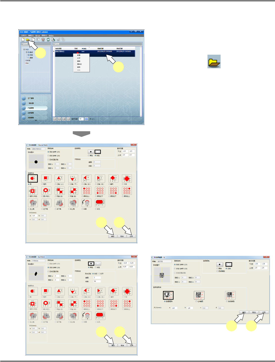 NPM-DGS 程序手册 5.7 标记的设定 EJS9AC-MB-05P-31 Page 5-139 5.7.3 标记的编辑 对已登录的标记、条形码进行编辑。 1 在 PCB 一览中选择要编辑的标记、条 形码。 2 选择工具栏的 ( 打开 ) , 或者菜单 栏的 [ 文件 ] [ 打开 ] ,或者在右击菜单 中选择 [ 打开 ] 。 显示出 < 标志编辑器 > 画面。 3 对要编辑的地方进行必要的设定, 点击 [ 应…