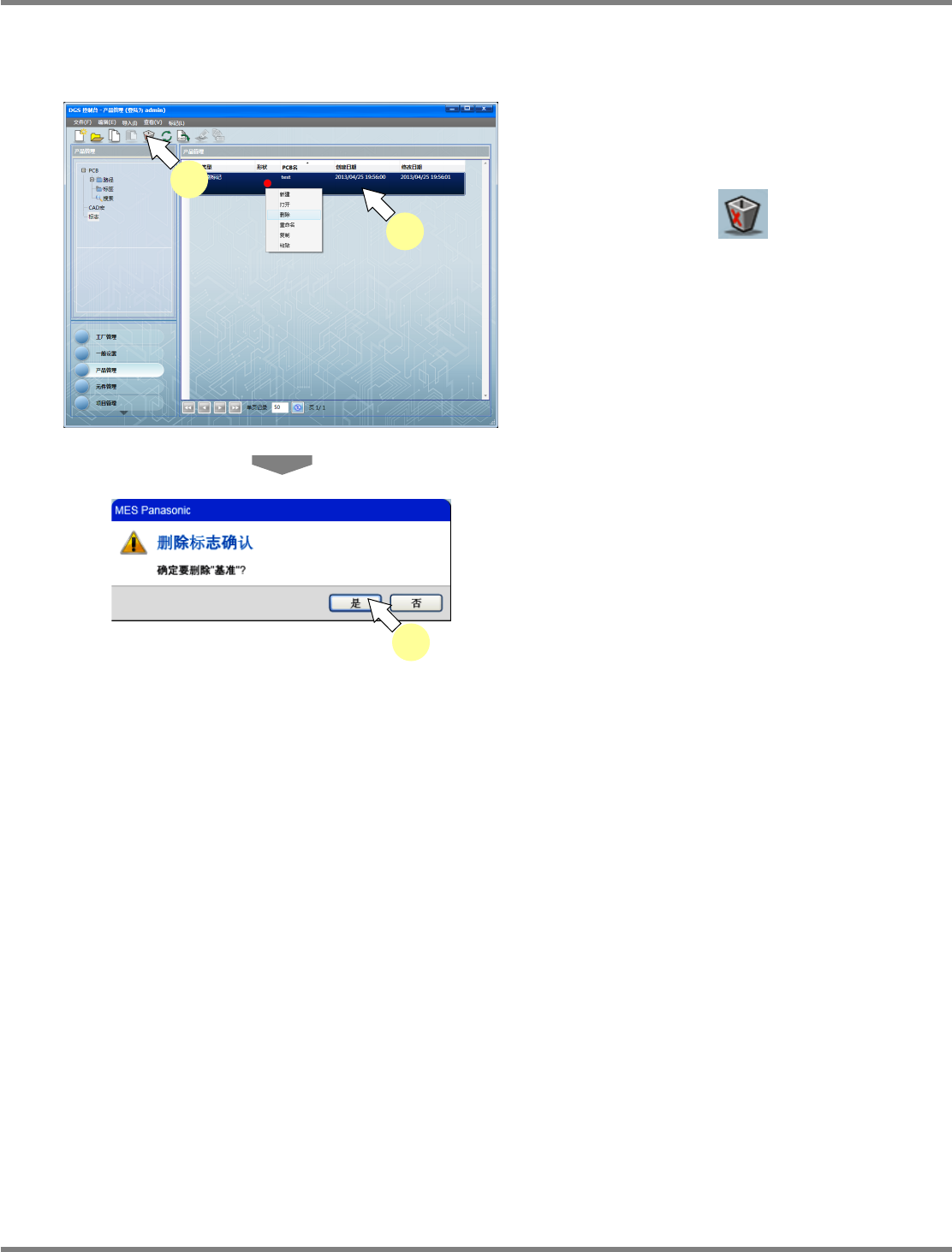 NPM-DGS 程序手册 5.7 标记的设定 EJS9AC-MB-05P-31 Page 5-141 5.7.5 标记的删除 对已登录的标记、条形码进行删除。 1 在 PCB 一览中选择要删除的标记、条 形码。 2 选择工具栏的 ( 删除 ) , 或者菜单 栏的 [ 编辑 ] [ 删除 ] ,或者在右击菜单 中选择 [ 删除 ] 。 显示出确认对话框。 3 点击 [ 是 ] 。 关闭确认画面。 标记、条形码将被删除。 P…