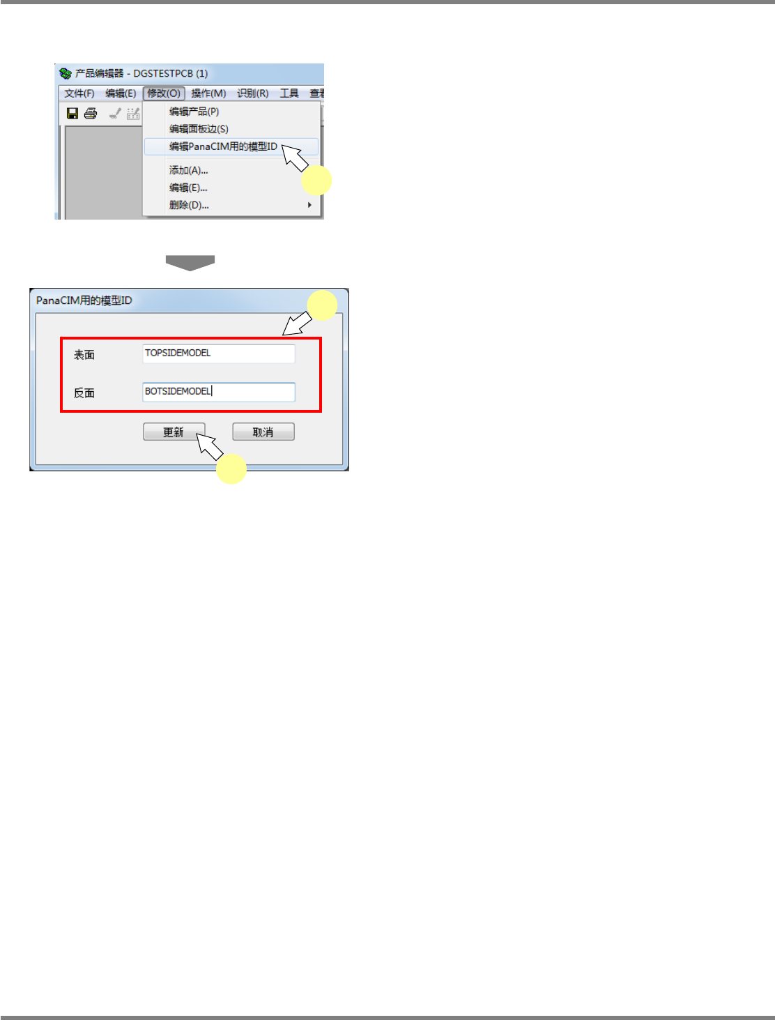 NPM-DGS 程序手册 5.8 PCB 编辑 Page 5-164 EJS9AC-MB-05P-31 编辑 PanaCIM 用的模型 ID 1 从菜单栏的 [ 修改 ] 点击 [ 编辑 PanaCIM 用的模型 ID] 。 显示出 <PanaCIM 用的模型 ID> 画面。 2 对想要进行设定的面输入模型 ID 。 模型 ID 使用以下的文字进行输入。 ・ 大写字母 - _ 按照 PanaCIM 的规定。 …