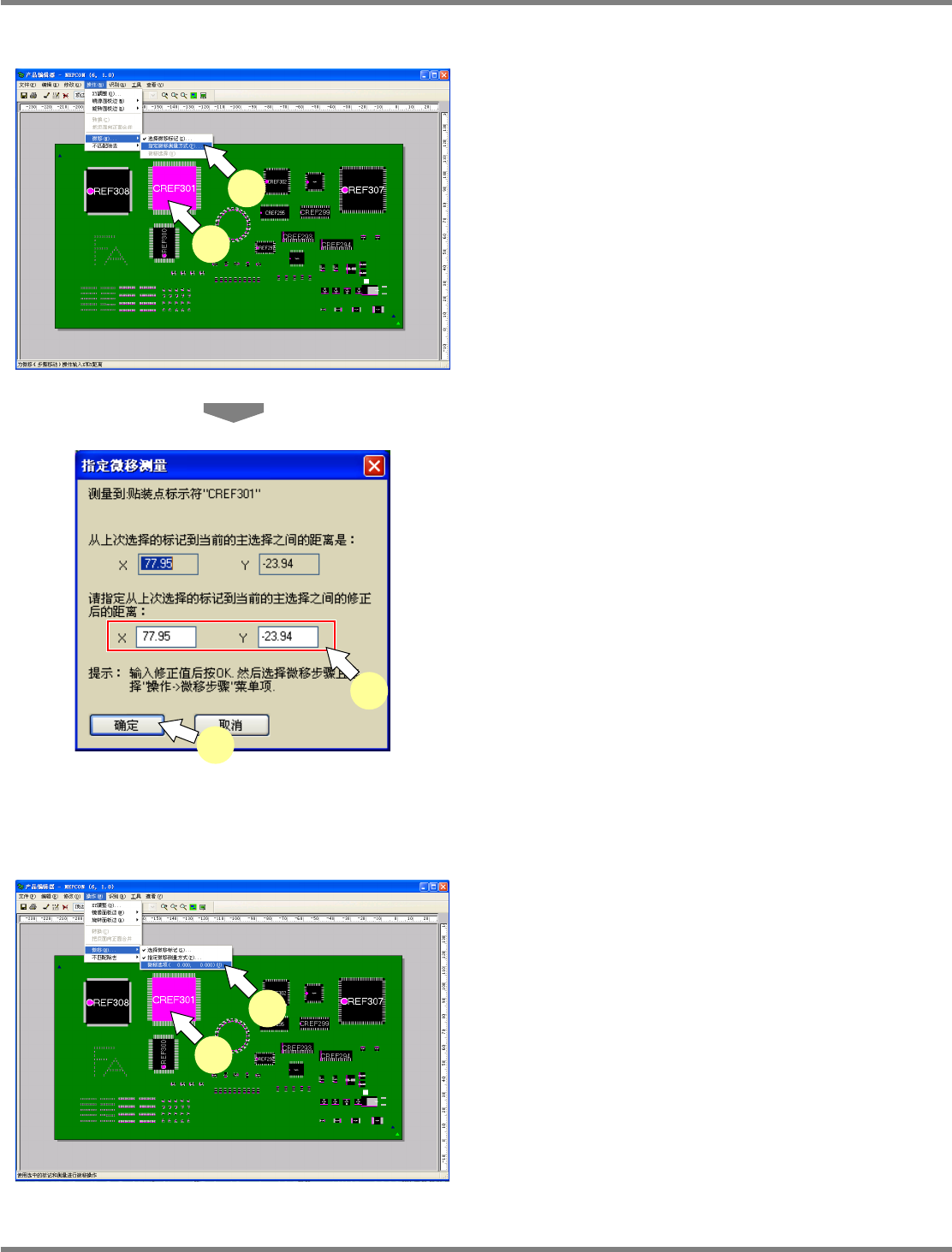 NPM-DGS 程序手册 5.8 PCB 编辑 EJS9AC-MB-05P-31 Page 5-177 位置的调整 ① 基准位置的选择 1 选择菜单栏的 [ 操作 ] [ 微移 ] [ 选择 微移标记 ] 。 显示出 < 选择微移标记 > 画面。 2 指定作为位置调整基准的位置。 在将 ‘ 选择的步骤 ’ 设为基准位置时,先在基板 上选择贴装点或标记后, 再执行 [ 操作 ] [ 微移 ] [ 选…