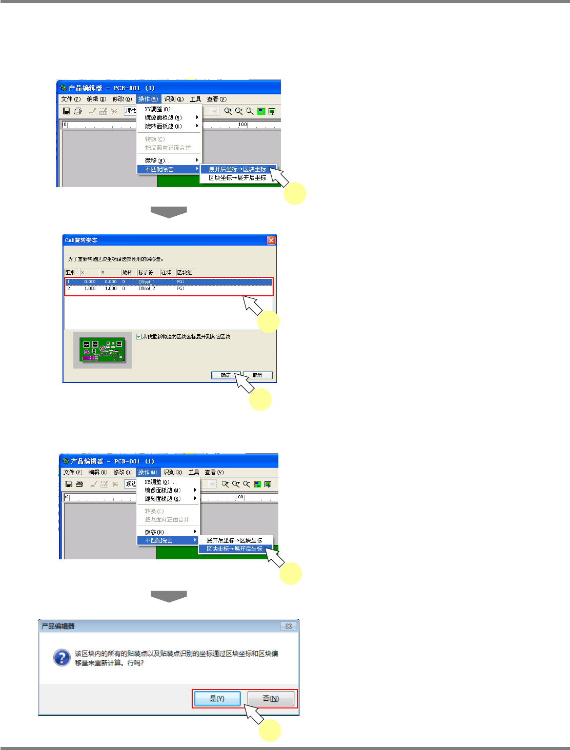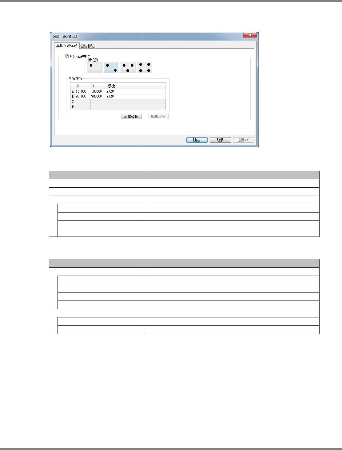 NPM-DGS 程序手册 5.8 PCB 编辑 Page 5-180 EJS9AC-MB-05P-31 基板识别标记 设定项目 项目 说明 ‘ 识别标记定义 ’ 使用基板识别标记时打勾。 ‘ 标记数 ’ 设定基板识别标记的数值。 ‘ 基板坐标 ’ ‘ X ’ 设定基板识别标记的 X 坐标。 ‘ Y ’ 设定基板识别标记的 Y 坐标。 ‘ 模板 ’ 用于基板识别标记的模板标记。 可以选择在 ‘5.7 标记设定 ’ 中编制 的模板标…