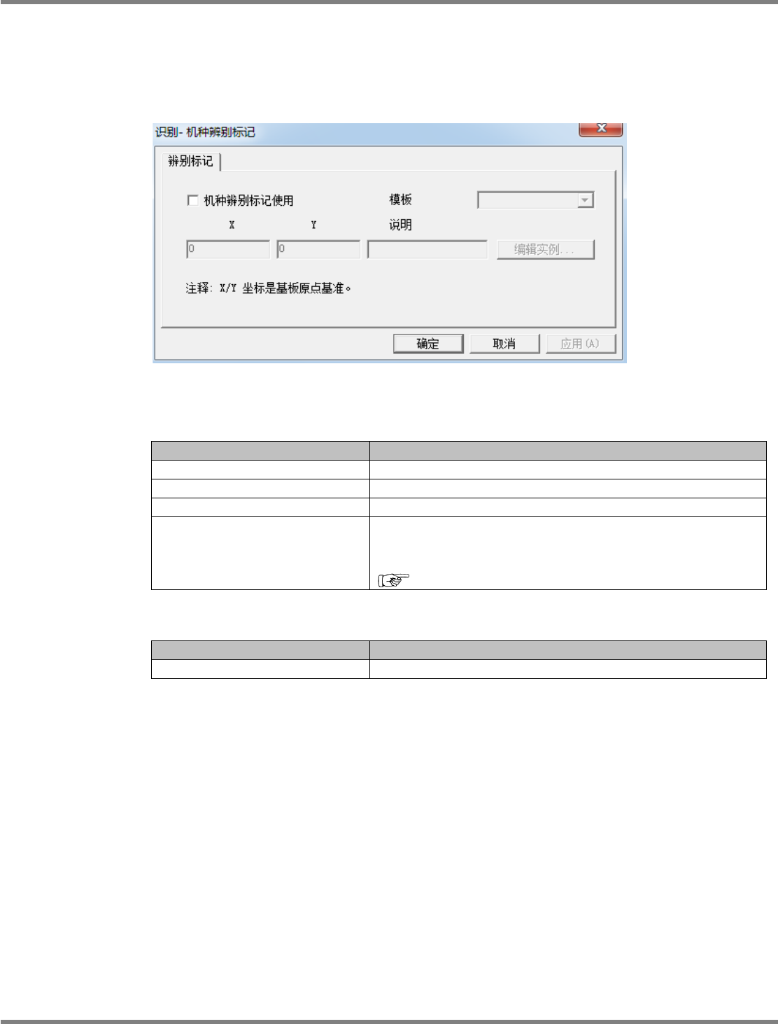 NPM-DGS 程序手册 5.8 PCB 编辑 Page 5-234 EJS9AC-MB-05P-31 ① 新建追加机种辨别标记 1 选择菜单栏的 [ 识别 ] [ 机种辨别标 记 ] 。 显示 < 识别 – 机种辨别标记 > 画面。 2 在 ‘ 机种辨别标记使用 ’ 的复选框中打 勾。 3 输入各机种标记的 X 、 Y 坐标。 机种辨别标记需要设定为与成对基板 相同的坐 标。 4 选择了模板时,从下拉菜单中选择…