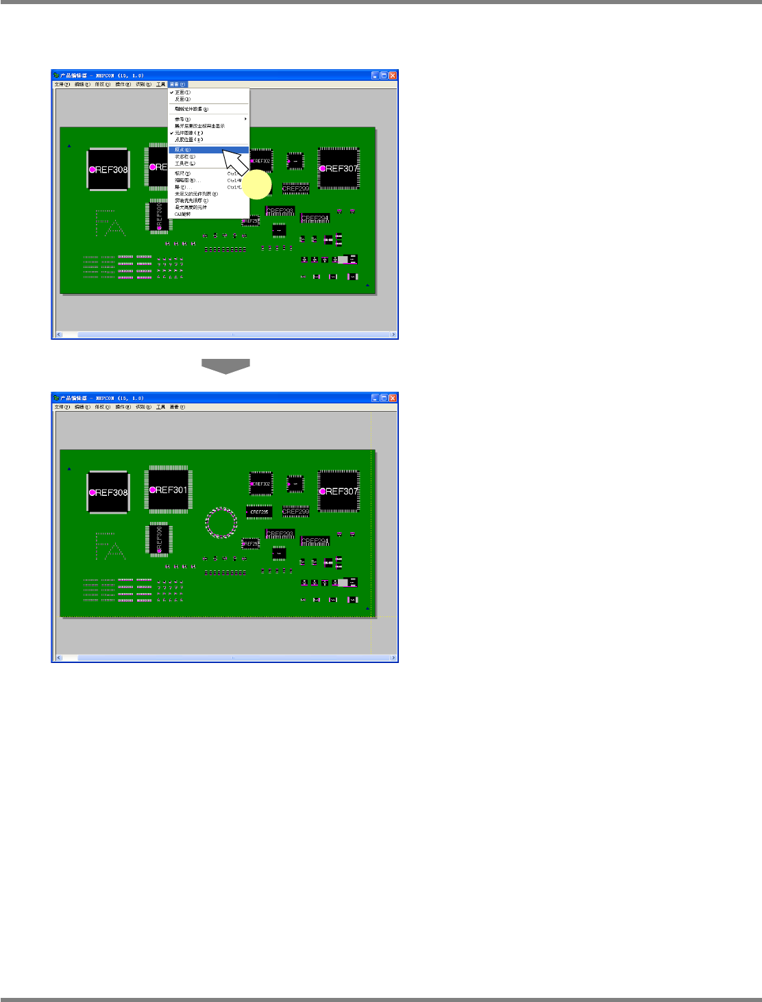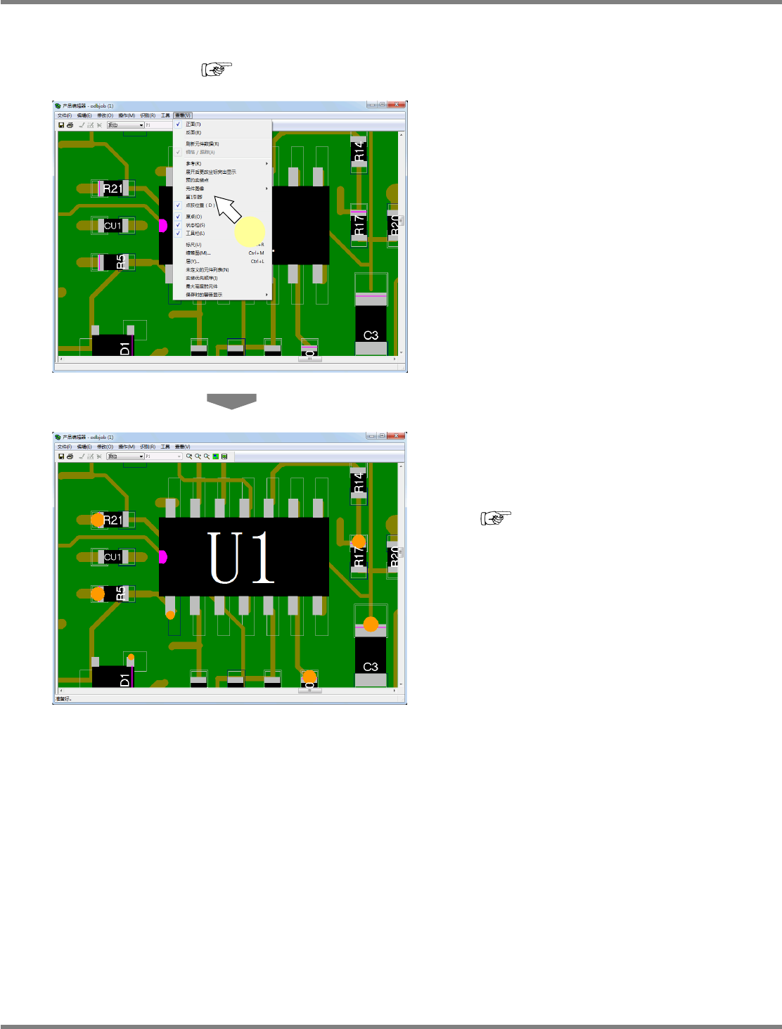 NPM-DGS 程序手册 5.8 PCB 编辑 Page 5-242 EJS9AC-MB-05P-31 点胶位置 1 选择菜单栏的 [ 查看 ] [ 点胶位置 ] 。 显示出点胶位置。 在已经设定了点胶选项的元件上,点 胶点将显 示如下。 红色 : 贴装前 蓝色 : 贴装后 Project050802S-1 02C02 1 Pro j ect050802S-103C 02 Project050802S-1 18C02