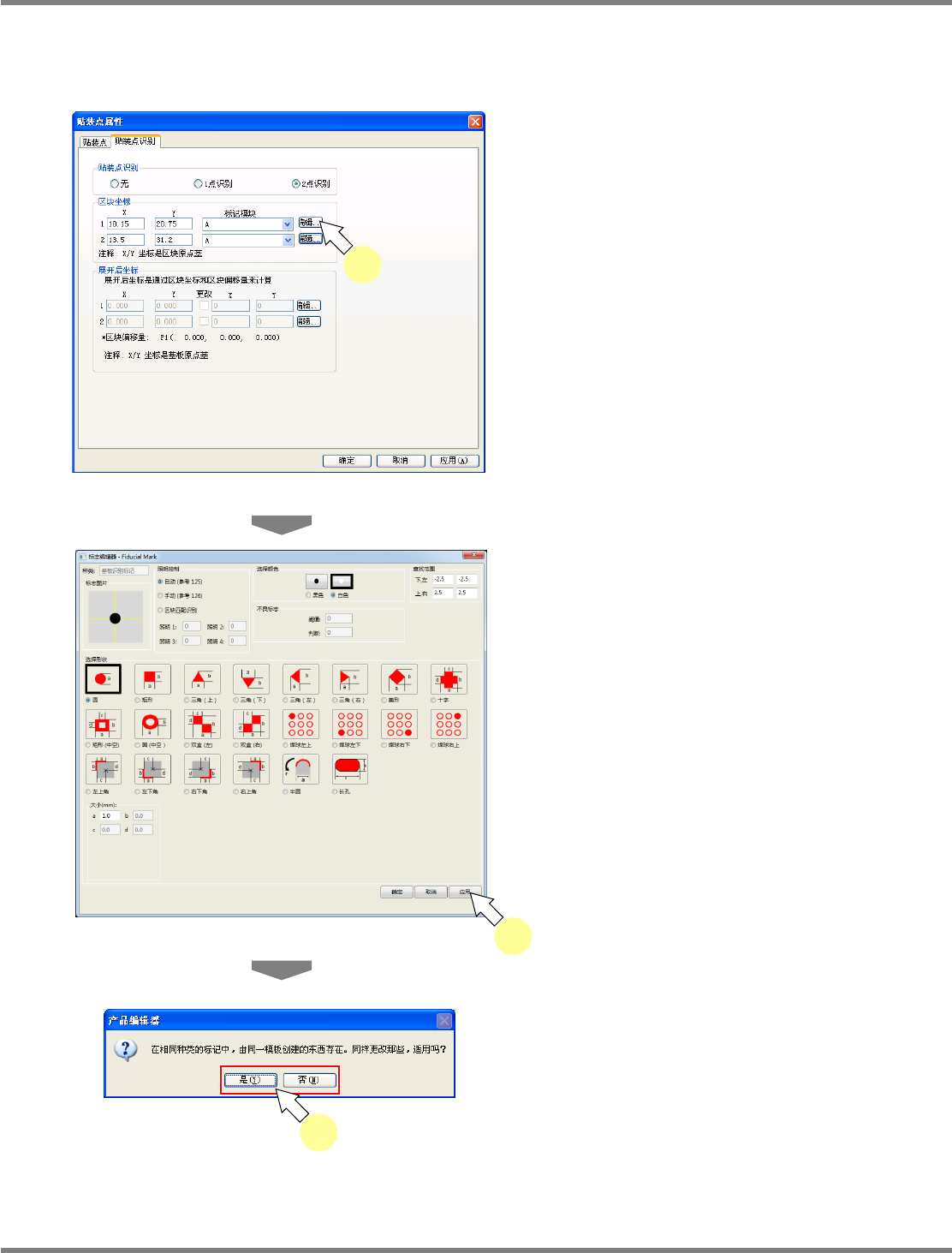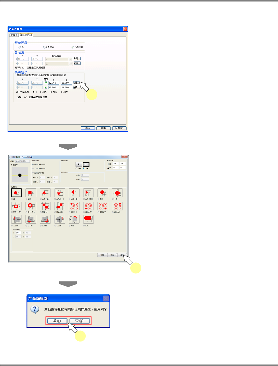 NPM-DGS 程序手册 5.8 PCB 编辑 Page 5-256 EJS9AC-MB-05P-31 当存在多个区块偏移量时 当基板拥有多个区块偏移量时,将在 编辑之际显示变更到其他偏移量 的确认对话框。 1 点击展开坐标上的 [ 编辑 ] 。 2 对需要进行编辑的部位执行所需的设 定后,点击 [ 应用 ] 。 如果这时在基板上存在多个区块偏移 量,将显 示确认对话框。 3 点击 [ 是 ] 或 [ 否 ] 。 [ 是 ] :…