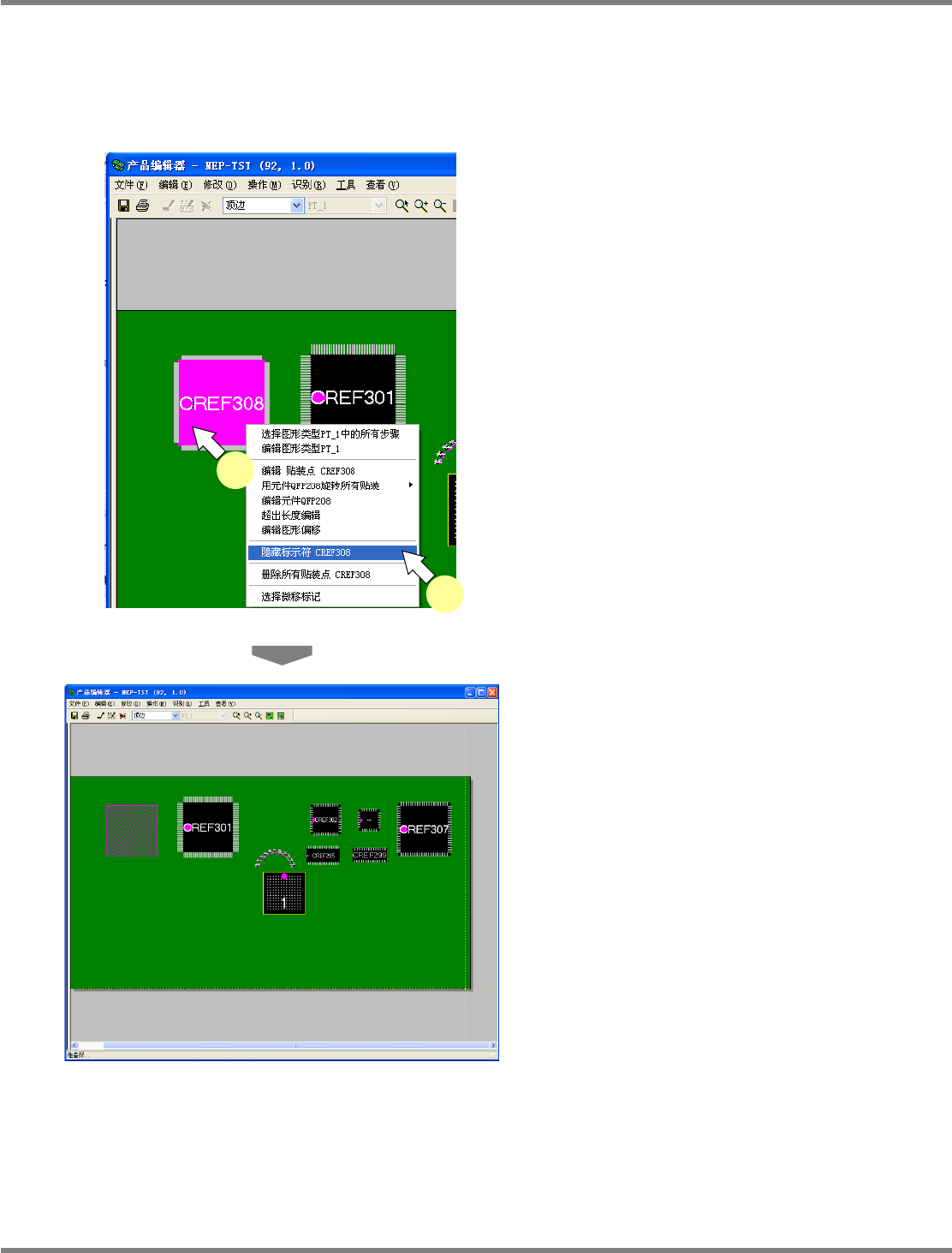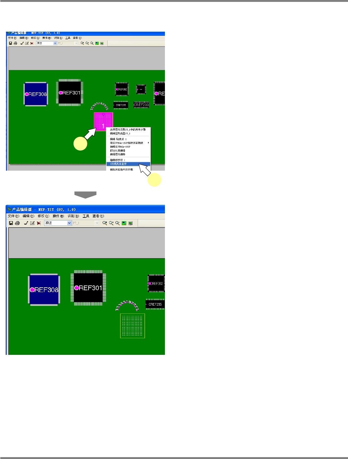 NPM-DGS 程序手册 5.8 PCB 编辑 Page 5-262 EJS9AC-MB-05P-31 不显示 / 显示 BGA 元件的模具 1 从 PCB 编辑器的 PCB 意象图中, 选择 需要隐藏的 BGA 元件。 2 在所选择的元件上, 从右击菜单中选择 [XXXX 的模具非显示 ] 。 在隐藏了 BGA 元件模具部的状态下, 针对这个 元件执行步骤 1 、 2 ,将显示隐藏的模具。 Project050804S-3 9…