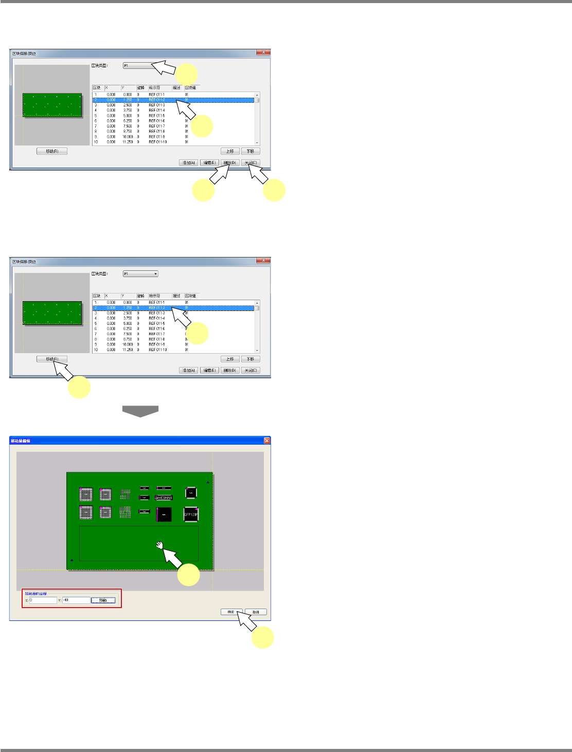 NPM-DGS 程序手册 5.8 PCB 编辑 EJS9AC-MB-05P-31 Page 5-301 偏移标签 在偏移标签上设定区块的偏移量。 添加偏移量时的画面 编辑偏移量时的画面 设定项目 项目 说明 ‘X’ 区块的 X 坐标。 ‘Y’ 区块的 Y 坐标。 ‘ 旋转 ’ 区块的角度。 除了可从 0° 、 90° 、 180° 、 270° 中选择以外,还可在 0°~ 360° 的 范围内输入任意的角度。 ‘ 备注 ’ 对于…