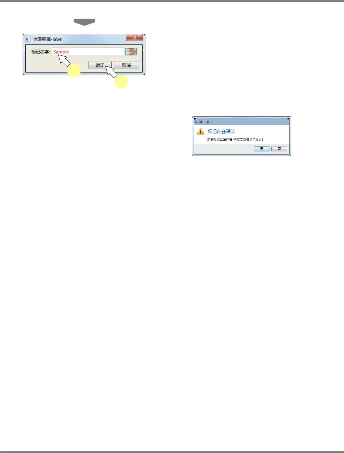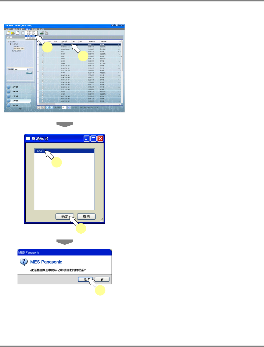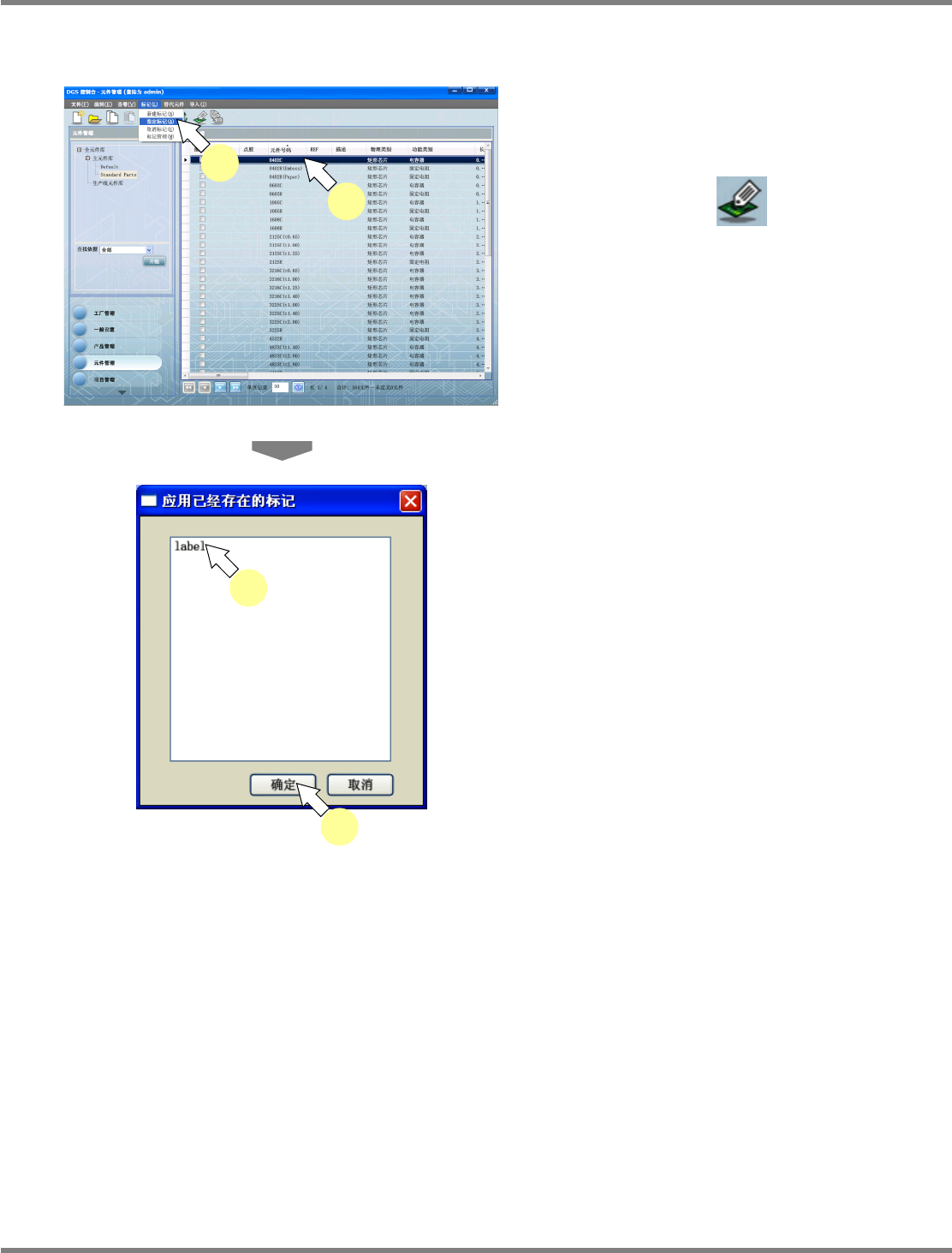 NPM-DGS 程序手册 6.3 元件检索 EJS9AC-MB-06P-28 Page 6-29 给元件指定标记 1 在元件一览中选择元件。 2 选择菜单栏的 [ 标记 ] [ 指定标记 ] ,或 点击工具栏的 ( 指定标记 ) , 或在 所选元件上弹出右击菜单, 选择 [ 指定标 记 ] 。 显示出 < 应用己经存在的标记 > 画面。 3 选择标签。 4 点击 [ 确定 ] 。 所选元件上将指定标记。 Pa…