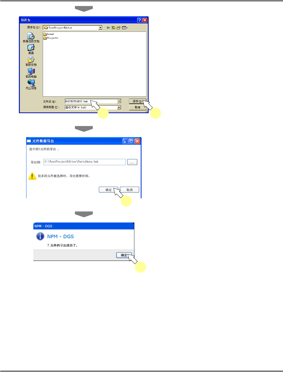 NPM-DGS 程序手册 6.4 元件的导入、导出 Page 6-58 EJS9AC-MB-06P-28 6.4.7 导出显示页面的元件 1 点击菜单栏的 [ 文件 ] [ 导出 ] 。 显示出文件名选择画面。 当元件数量多、有多个页面时,将只 导出显示 中的纪录。请显示出需要导出的页面 后再执行 导出。 2 点击 。 显示出 < 另存为 > 画面。 3 输入要保存的文件,点击 [ 保存 ] 。 所输入的…