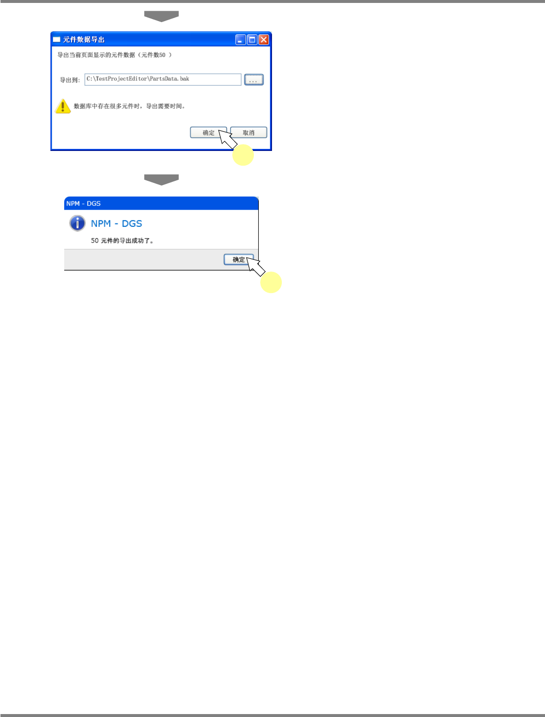 NPM-DGS 程序手册 6.4 元件的导入、导出 EJS9AC-MB-06P-28 Page 6-59 4 点击 [ 确定 ] 。 显示出确认画面。 5 点击 [ 确定 ] 。 Parts060400S-2 6C01 4 Parts060400S-2 7C01 5