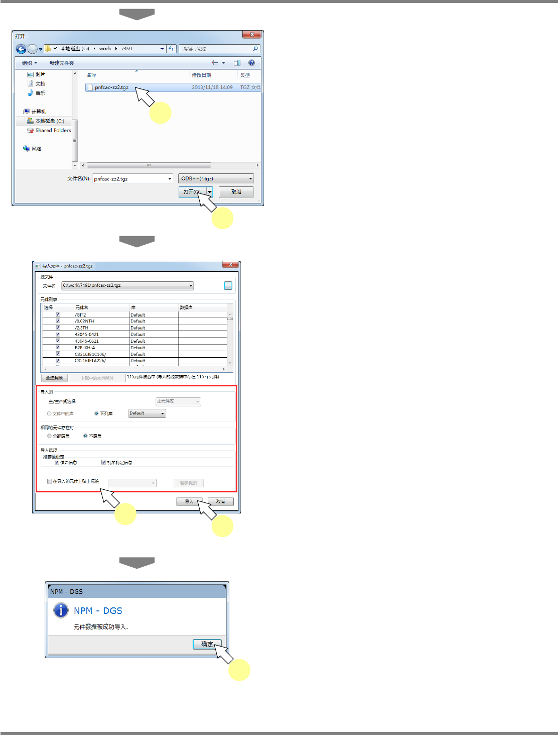 NPM-DGS 程序手册 6.4 元件的导入、导出 EJS9AC-MB-06P-28 Page 6-67 元件导入的设定项目 项目 说明 ‘ 选择 ’( 复选框 ) 选择导入的元件。初期显示为选择了 全部元件的状态。 ‘ 元件名 ’ ‘ 库 ’ 显示导入元件的元件库名称。 ‘ 数据库 ’ 显示是否即已存在与导入元件相同的 元件。 ‘ 导入到 ’ 导入到仅限指定的主控元件库。 ‘ 下列库 ’ 指定收纳元件数据的文件夹。 能够通过下拉菜…