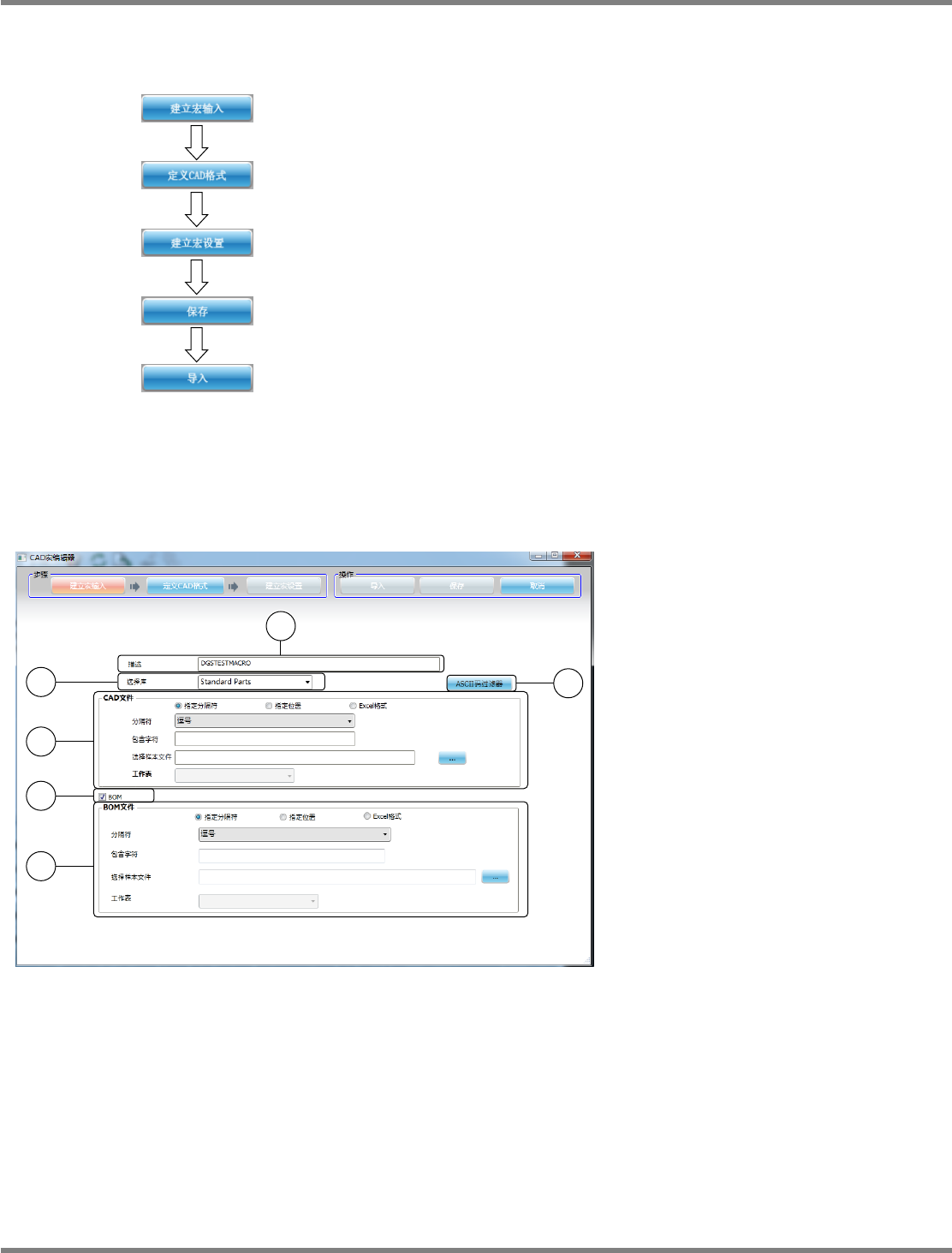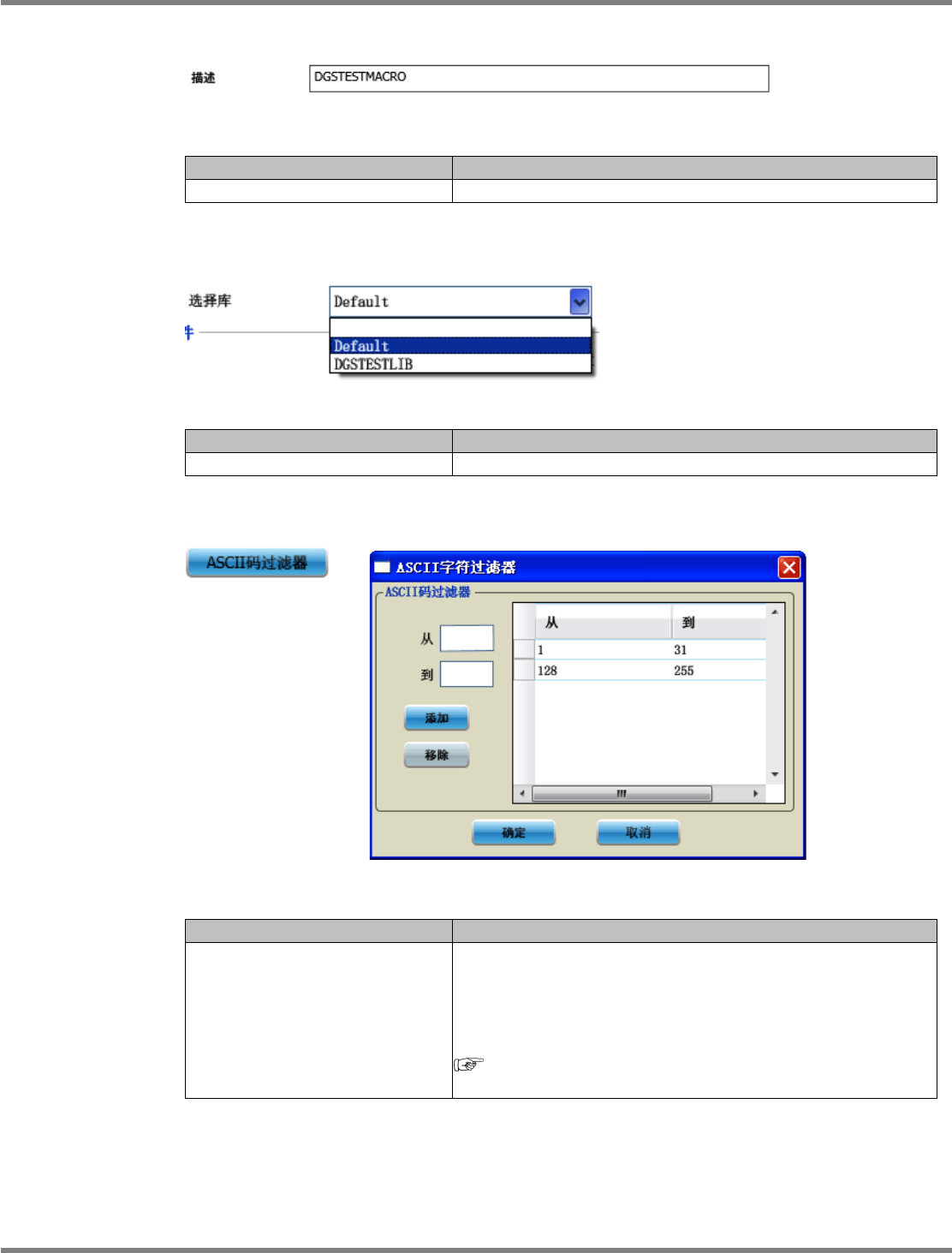 NPM-DGS 程序手册 5.2 CAD 宏的定义 EJS9AC-MB-05P-31 Page 5-31 ① 描述 设定项目 项目 说明 ‘ 描述 ’ 请任意输入宏的说明。 ② 选择库 设定项目 项目 说明 ‘ 选择库 ’ 指定对于 CAD 系统使用的元件程序库。 ③ ASCII 码过滤器 设定项目 项目 说明 [ASCII 码过滤器 ] 获取 CAD 文件时,设定不要获取的 ASCII 字符。点击本按钮, 将会显示 <…