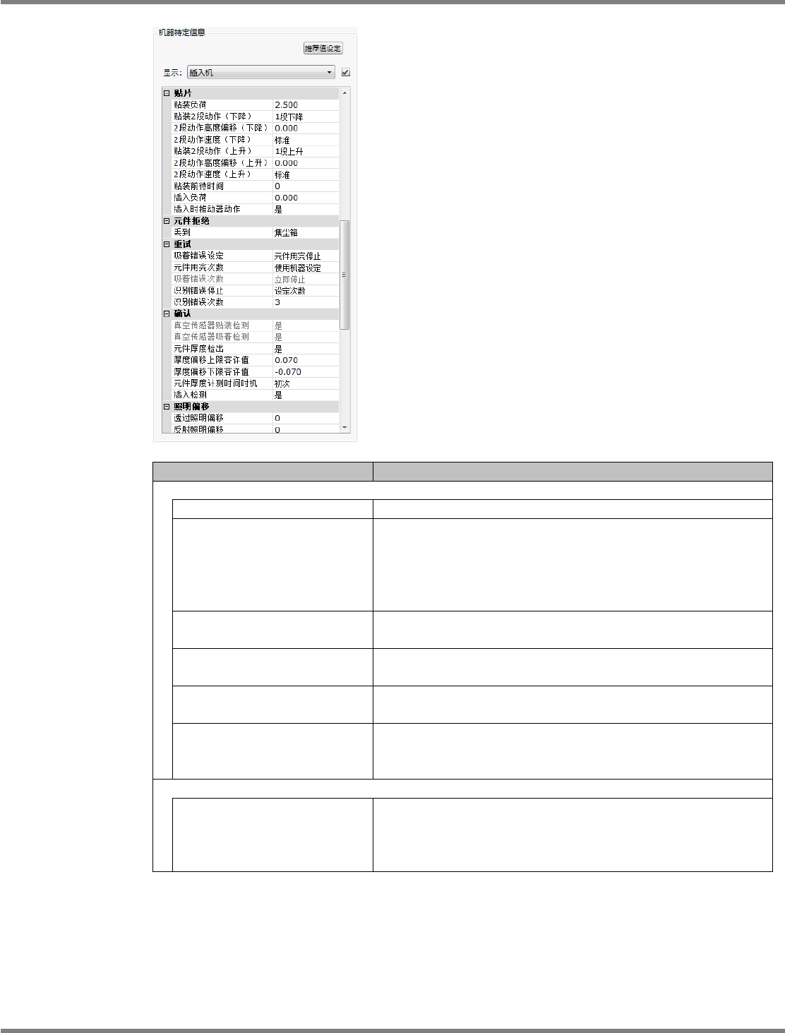 NPM-DGS 程序手册 6.5 添加新的元件 EJS9AC-MB-06P-28 Page 6-117 项目 说明 ‘ 贴片 ’ ‘ 贴装负荷 ’ 在进行贴片时对元件施加的负荷。 ‘ 贴装动作 ’ 设定贴片时的吸嘴下降动作。有以下 两种 : • [1 步 ] • [2 步 ] ( 使用 2 吸嘴通用吸头时, 因为时常进行下降 2 层动作, 所以忽视 此数值 ) ‘2 段下降开始位置偏移量 ’ 在贴装动作中进行 2 段下降时, 设定为想比…