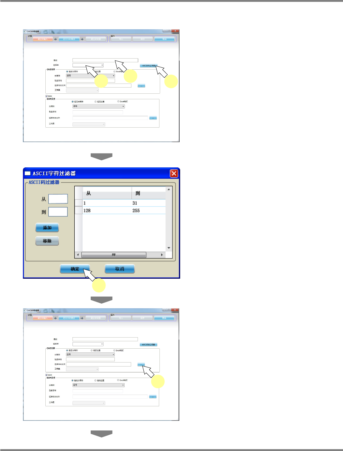 NPM-DGS 程序手册 5.2 CAD 宏的定义 EJS9AC-MB-05P-31 Page 5-37 设定输入文件 1 在 ‘ 描述 ’ 栏中输入宏的详细说明。 请记述要进行定义的宏的有关说明。 ( 任意 ) 2 选择将获取的元件链接到的元件程序 库。 3 为了特定在导入时无视的 ASCII 字符, 点击 [ASCII 码过滤器 ] 。 将会显示 <ASCII 字符过滤器 > 画面。 4 添加无视的 ASCI…