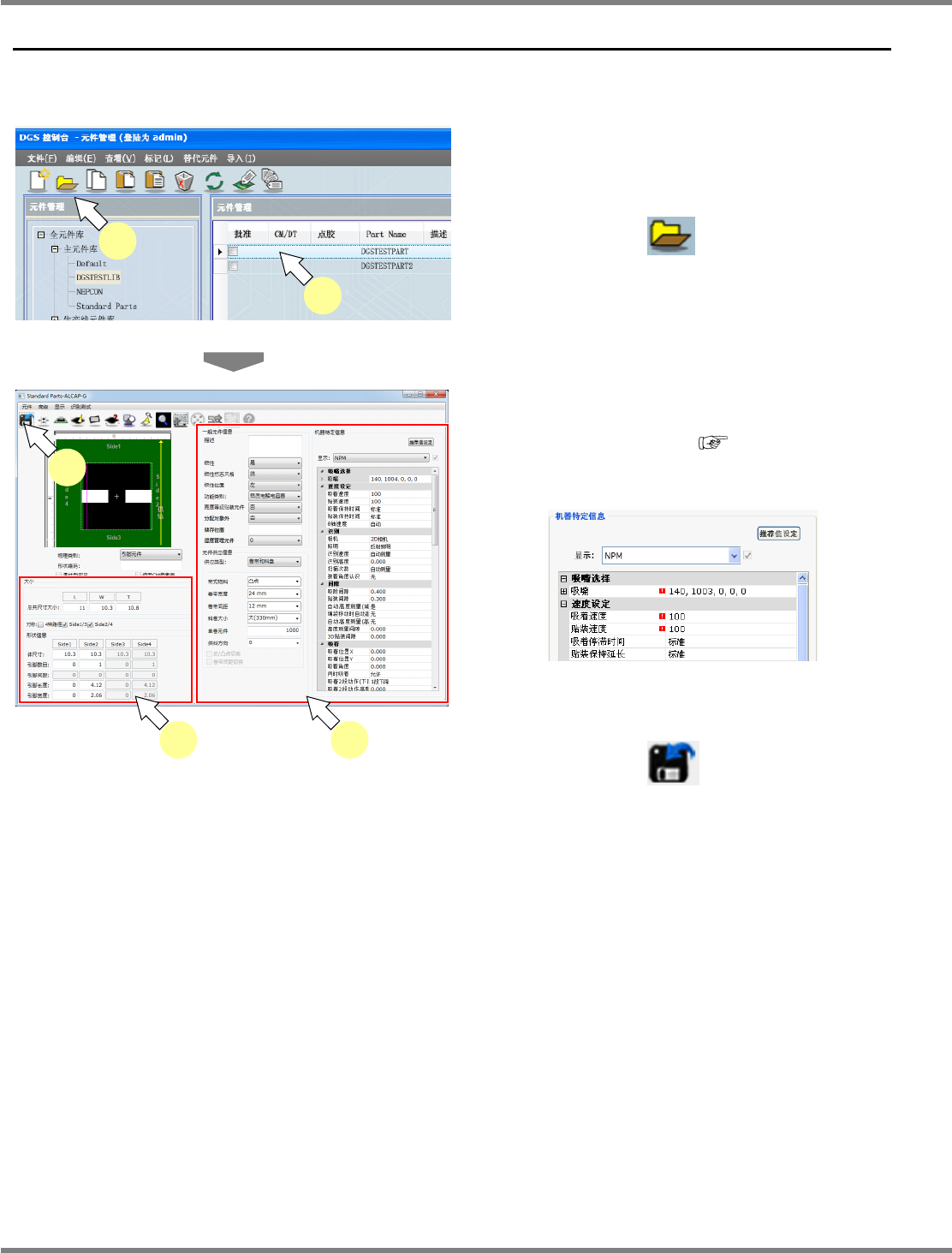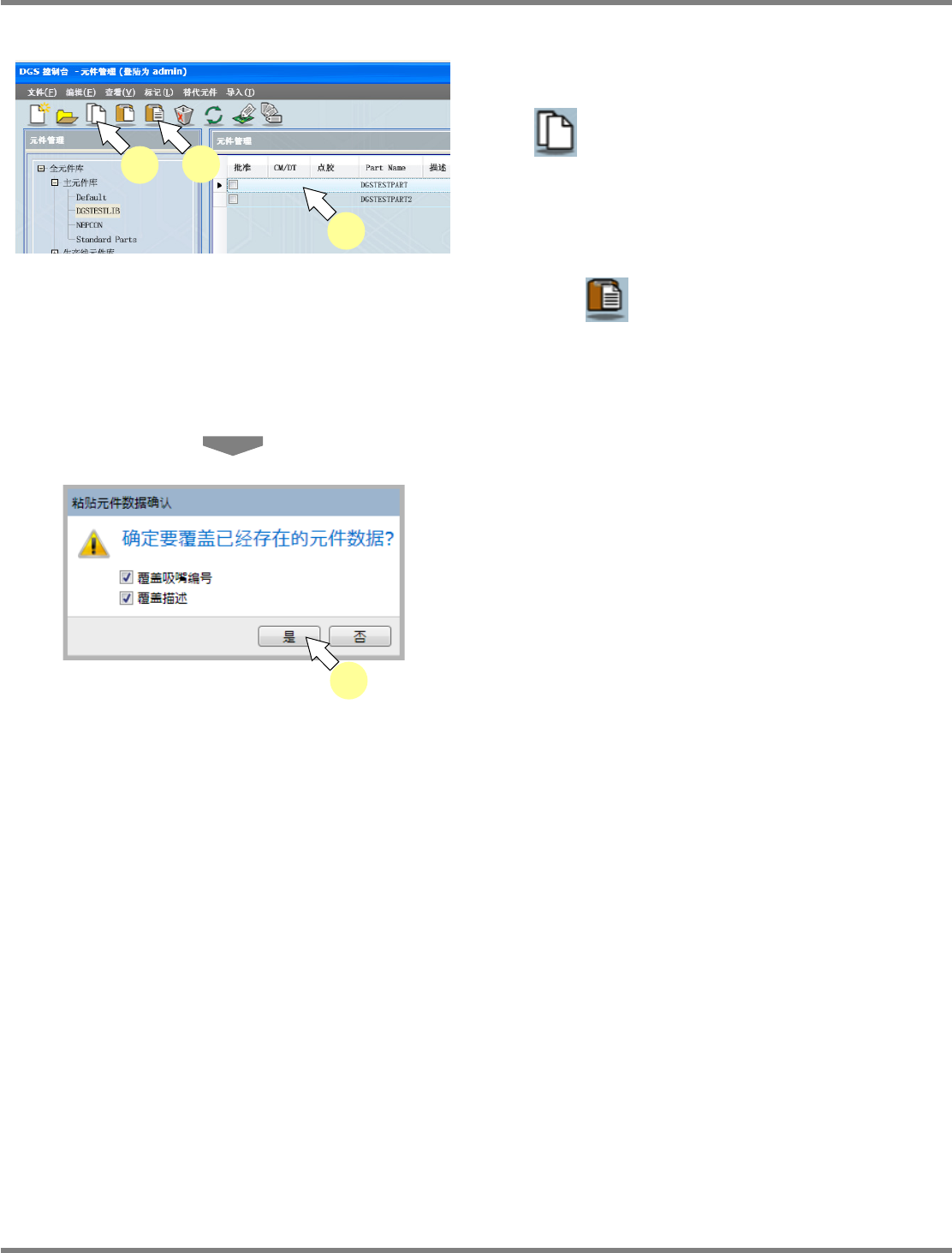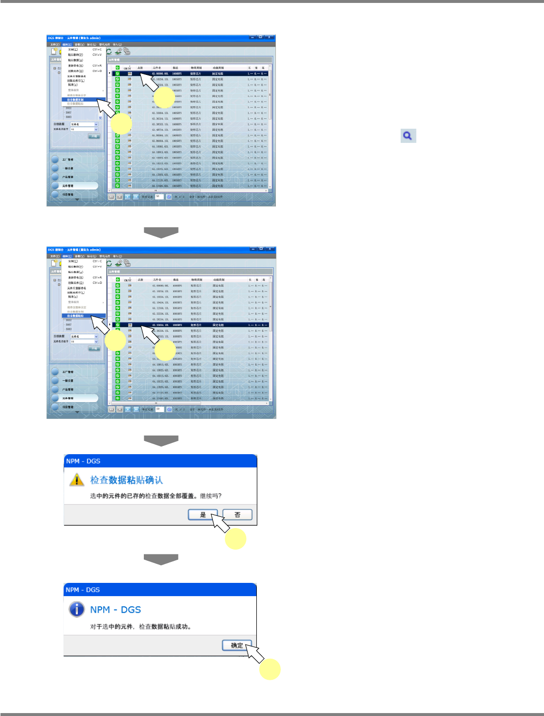 NPM-DGS 程序手册 6.6 复制元件 EJS9AC-MB-06P-28 Page 6-183 6.6.3 检查数据复制 1 选择需要复制的元件后, 再选择菜单栏 的 [ 编辑 ] [ 检查数据复制 ] ,或者从需 要复制的元件右击菜单上选择 [ 检查数 据复制 ] 。 在复制源上显示拥有检查数据的元件 时,可通 过 [ 显示 ]→[ 选择详细 ...] 对检查进行设定后, 再通 过元件一览上的 图标显示。 2 选择复制处元…