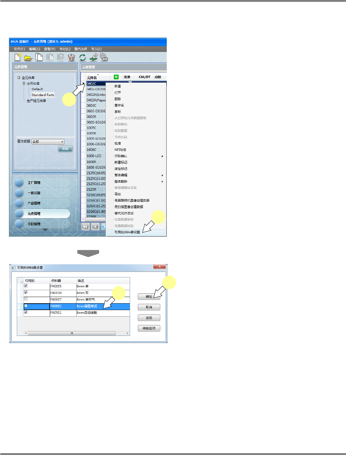 不使用特定供料器的设定。设定只对元件程序库中的元件有效。