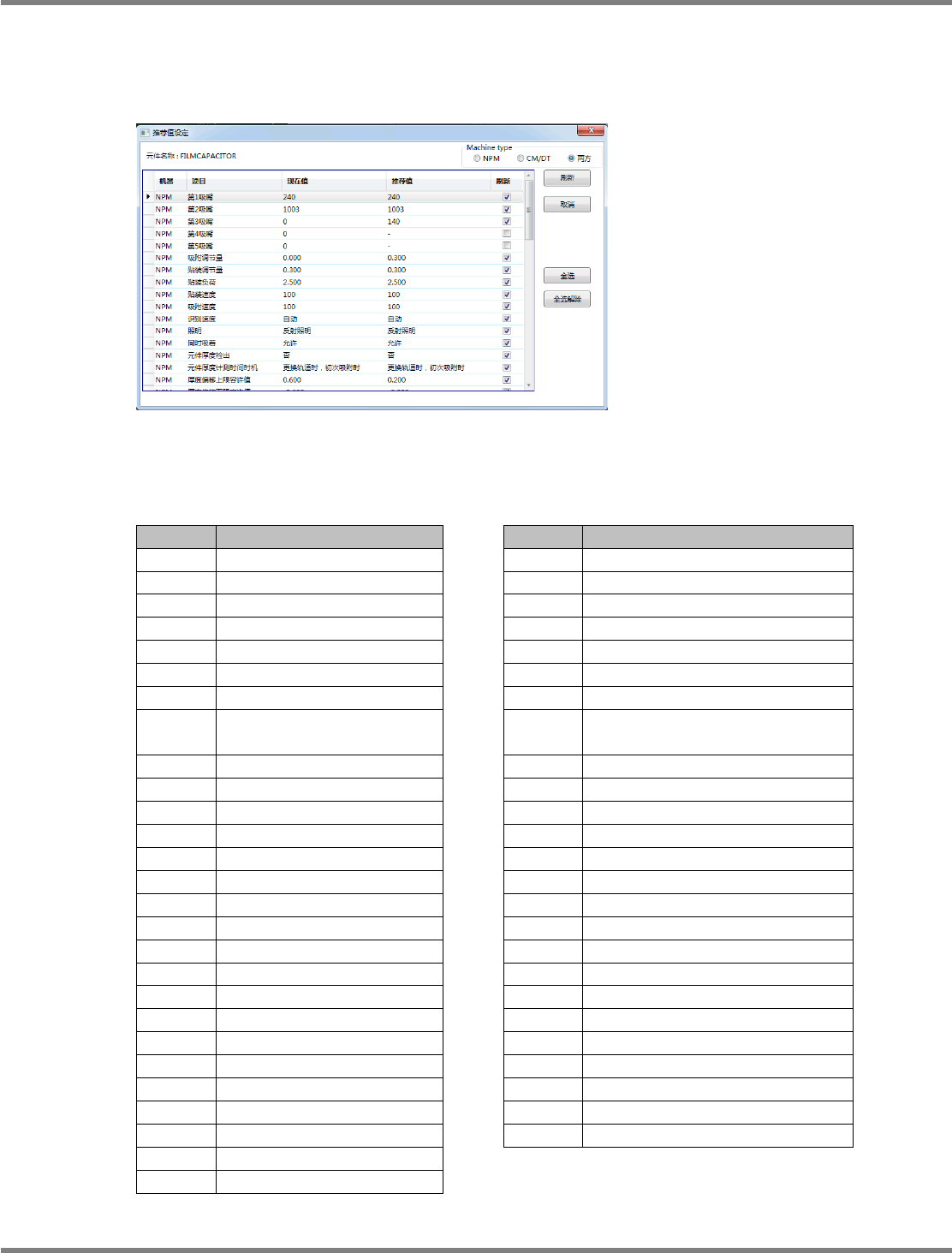 NPM-DGS 程序手册 6.7 现有元件的编辑 Page 6-200 EJS9AC-MB-06P-28 推荐值设定画面 推荐值的设定,因机种与元件种类的 不同,已分别自动设定。 选择了 [ 推荐值整体设定 ] 时,不会显示推荐值设定画面。 设定项目 各个选择 ‘NPM’ 、 ‘CM/DT ’ 后按下 [ 刷新 ] ,即会显示如下所示的设定项目。 机种 : NPM 机种 : CM/DT 机器 项目 机器 项目 NPM 第 1…